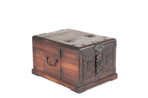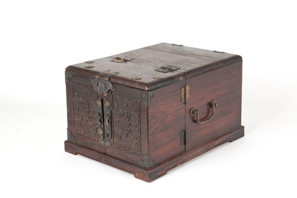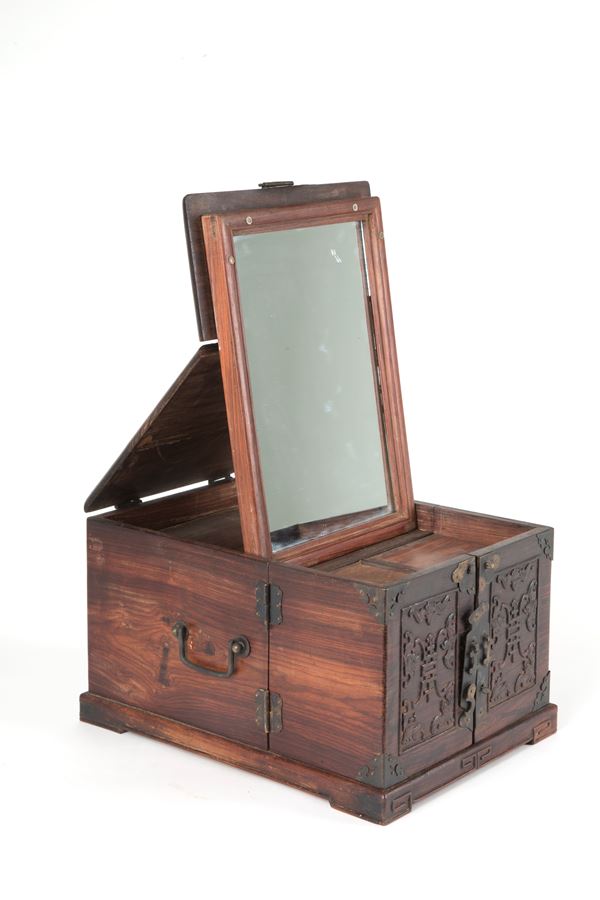Cofanetto da viaggio in legno con meccanismo apribile con all'interno cassetti e specchiera. Cina. Segni di usura del tempo.