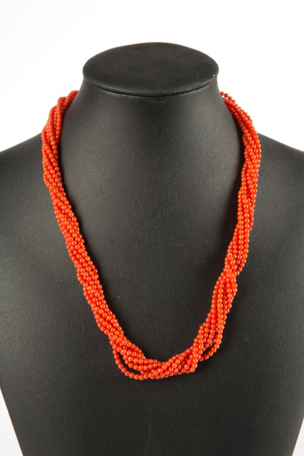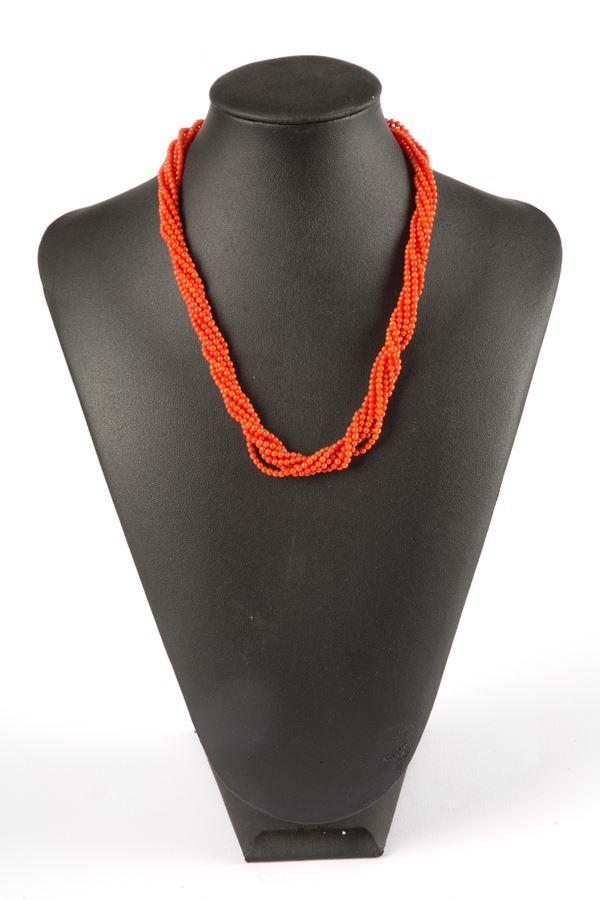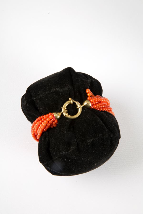 Collana e bracciale in corallo rosso torchon con chiusura in argento dorato, gr. 63 ca. complessivi.