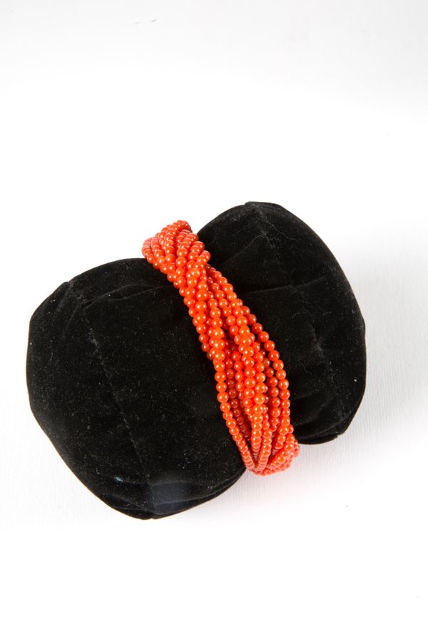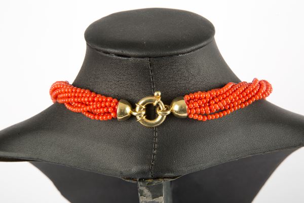Collana e bracciale in corallo rosso torchon con chiusura in argento dorato, gr. 81 ca. complessivi.