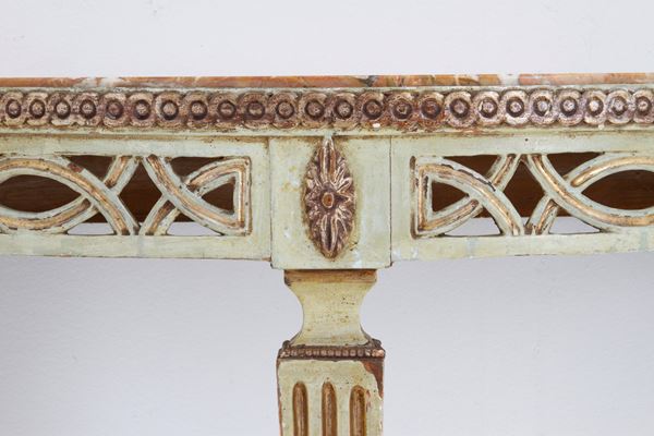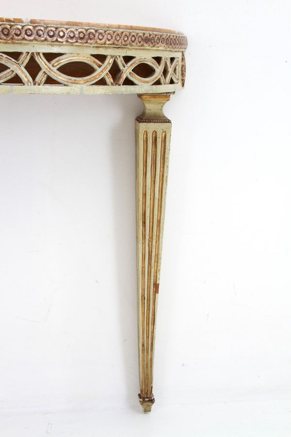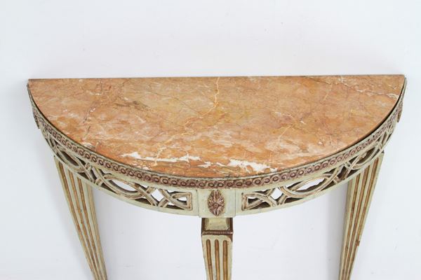 Consolle a mezza luna in legno intagliato e laccato con piano in marmo. Inizi XX secolo. Lievi difetti.