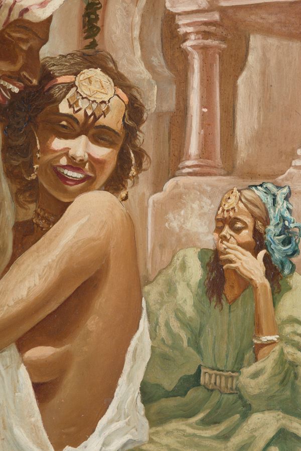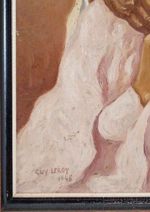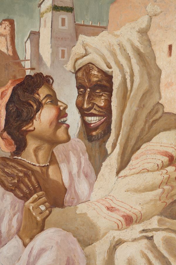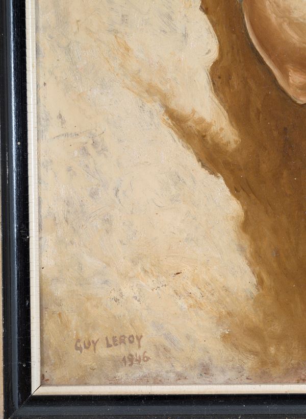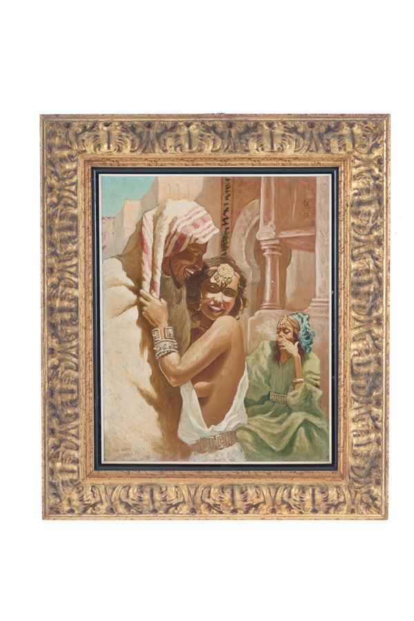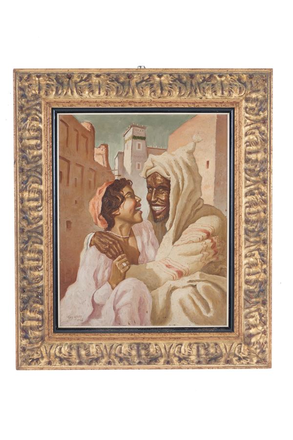 Coppia di dipinti olio su masonite raffiguranti "PERSONAGGI ORIENTALISTI". Firmati GUY LEROY e datati 1946 in basso a sinistra. In cornici dorate.