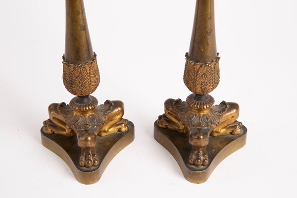 Coppia di piccoli candelieri in bronzo cesellato, brunito e dorato. Periodo Impero. Lievi difetti.