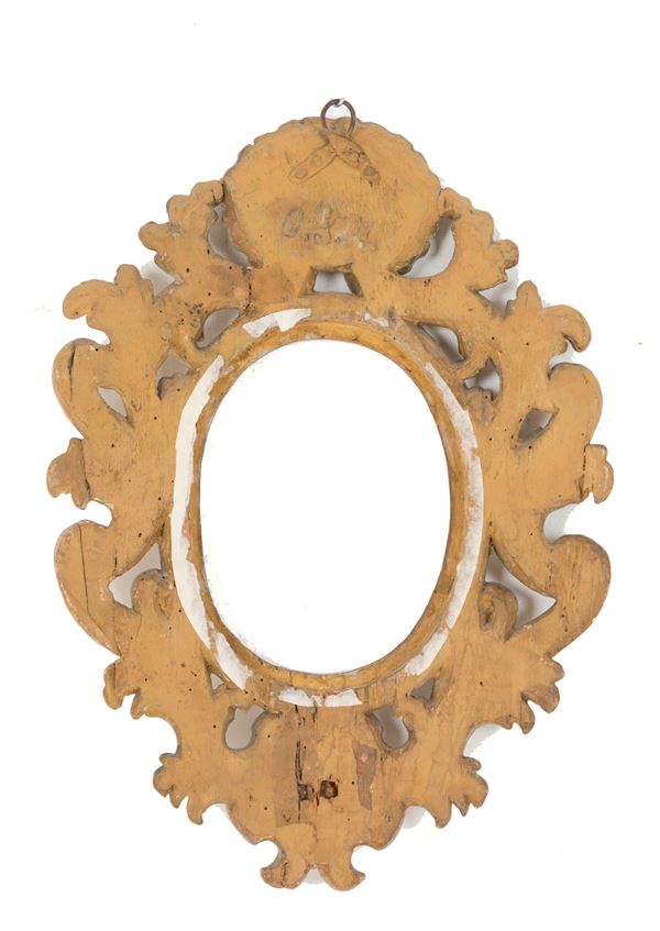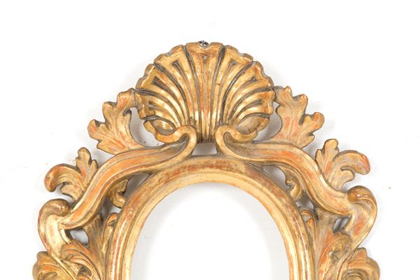 Cornice in legno intagliato e dorato con cimasa a valva di conchiglia. Periodo Luigi XV. Lievi difetti.