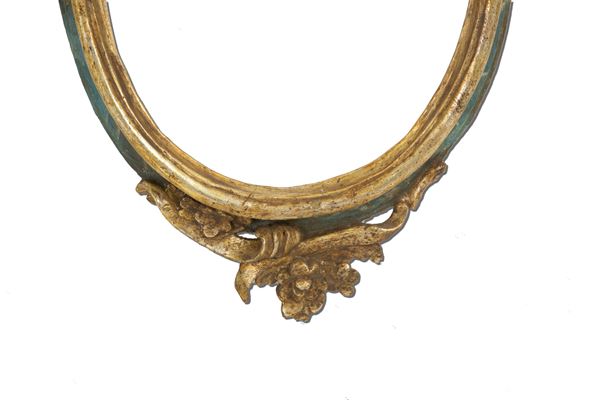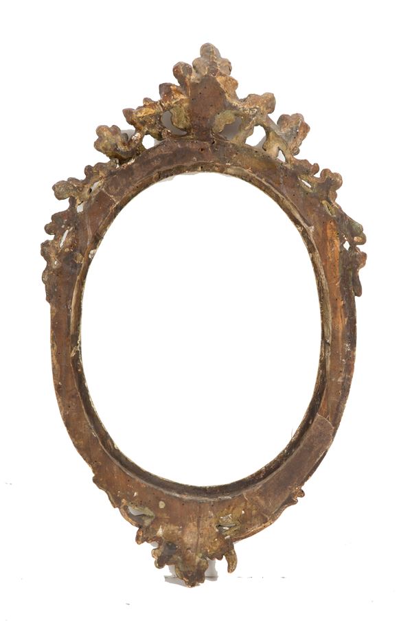 Cornice ovale in legno intagliato, laccato e dorato. XIX secolo. Lievi difetti.
