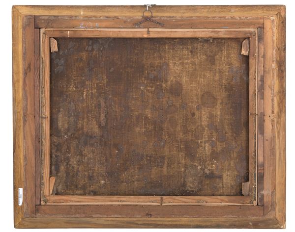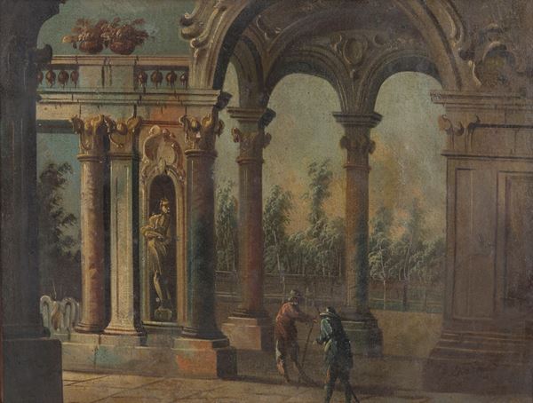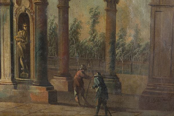 Dipinto olio su tela raffigurante "ARCHITETTURA CON PERSONAGGI". Fine XVIII-inizi XIX secolo. In cornice intagliata e dorata. Restauri.