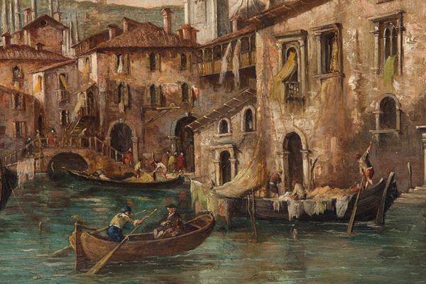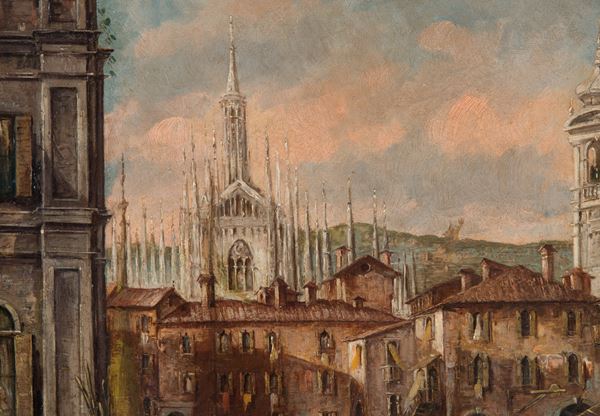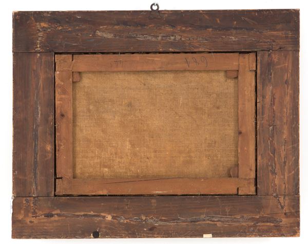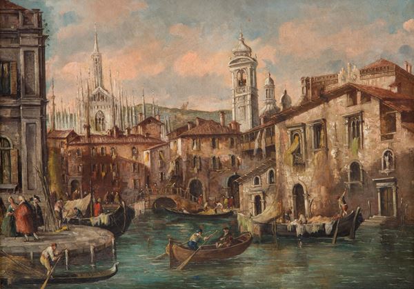 Dipinto olio su tela intitolato "IL LAGHETTO DELL'OSPEDALE MAGGIORE DI MILANO". Fine XIX secolo. In elegante cornice coeva in legno intagliato e dorato.