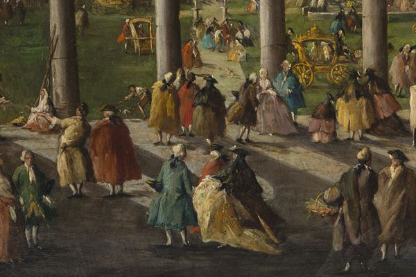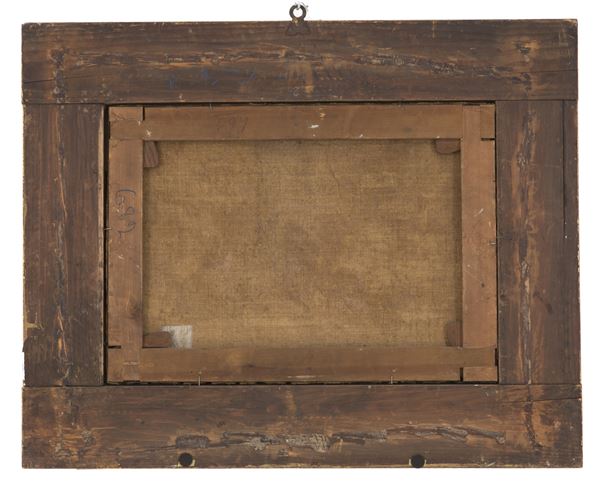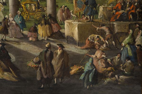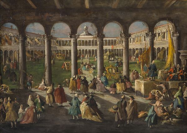 Dipinto olio su tela intitolato "LA FESTA DEL PERDONO NEI CORTILI DELL'OSPEDALE MAGGIORE DI MILANO". Fine XIX secolo. In elegante cornice coeva in legno intagliato e dorato. Lievi restauri.