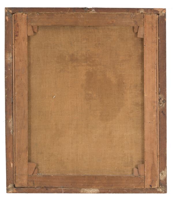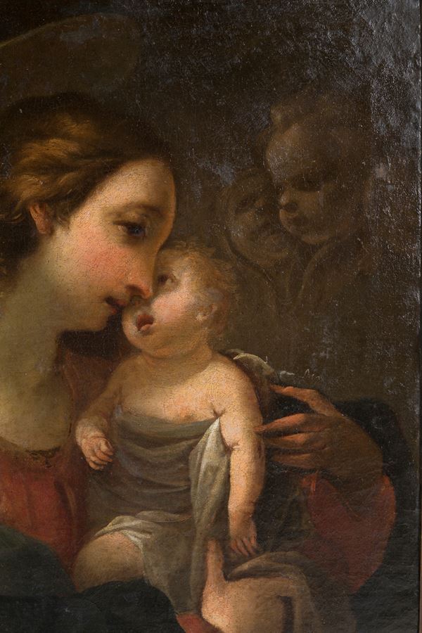 PITTORE TOSCANO DEL XVII SECOLO. Dipinto olio su tela raffigurante "MADONNA CON BAMBINO". In cornice in legno intagliato e dorato. Già rintelato e rintelaiato.