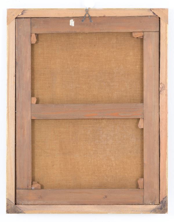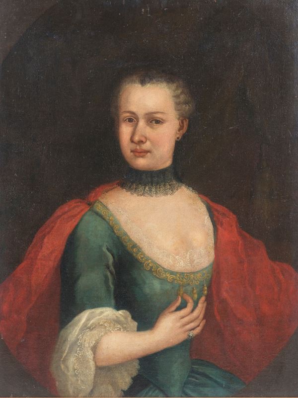 Dipinto olio su tela raffigurante "NOBILDONNA". Seconda metà del XVIII secolo. In cornice dorata. Già rintelato e rintelaiato. Restauri.
