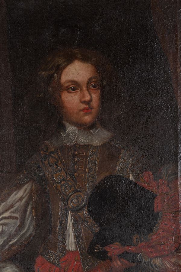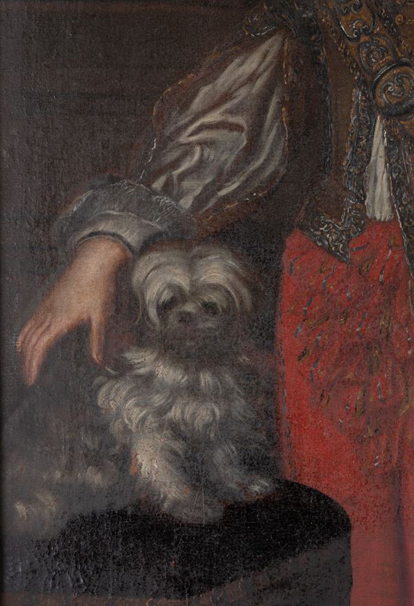 PITTORE FIAMMINGO DI FINE XVII SECOLO. Dipinto olio su tela raffigurante "RITRATTO DI GENTILUOMO CON CANE". In cornice in legno lastronato. Restauri e piccoli difetti. Già rintelato e rintelaiato.