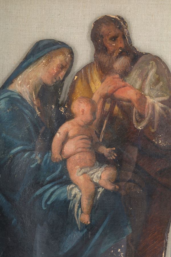 Dipinto olio su tela sagomata applicato su tavoletta raffigurante "SACRA FAMIGLIA". XVII secolo. In teca. Difetti.