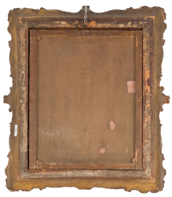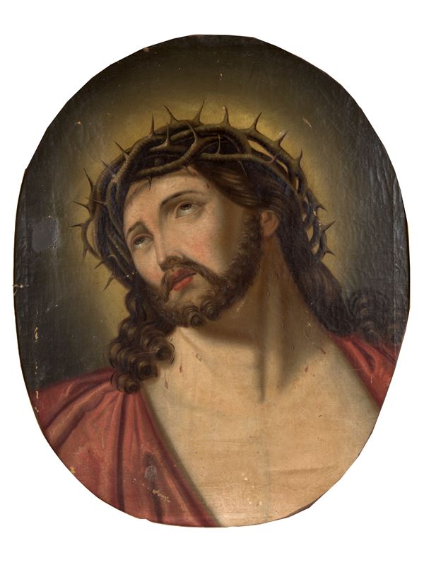 Dipinto olio su tela raffigurante "VOLTO DI CRISTO". XIX secolo. In elegante cornice. Difetti e restauri.