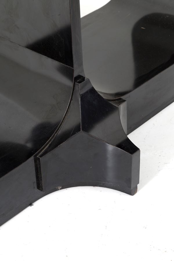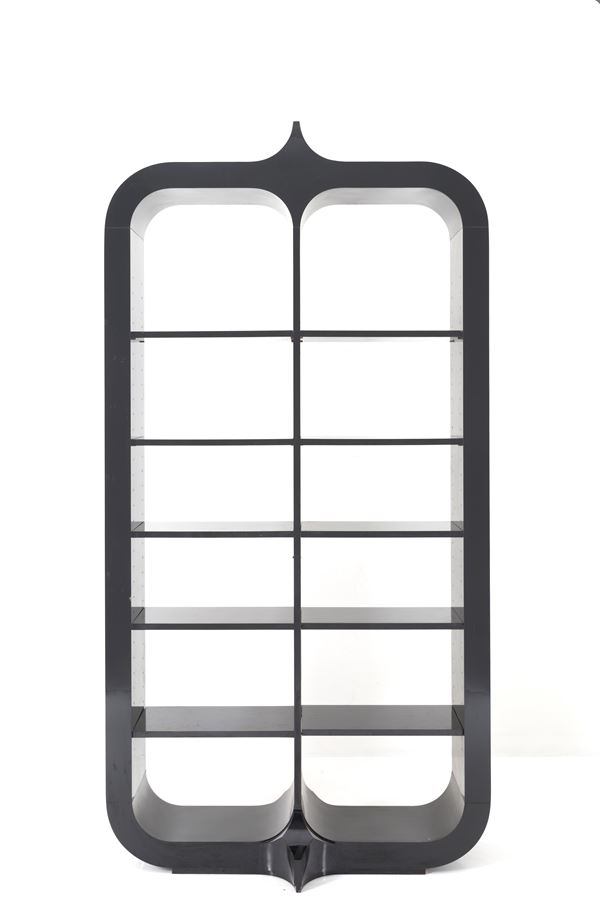Libreria da centro in legno laccato nero con dieci ripiani regolabili. Produzione PIERRE CARDIN. Anni '80. Lievi difetti e segni di usura del tempo.