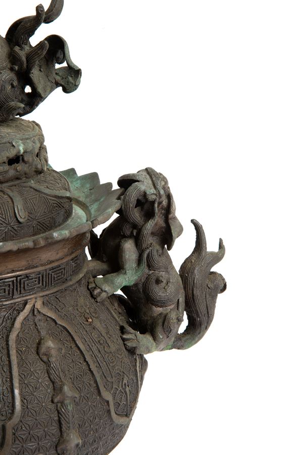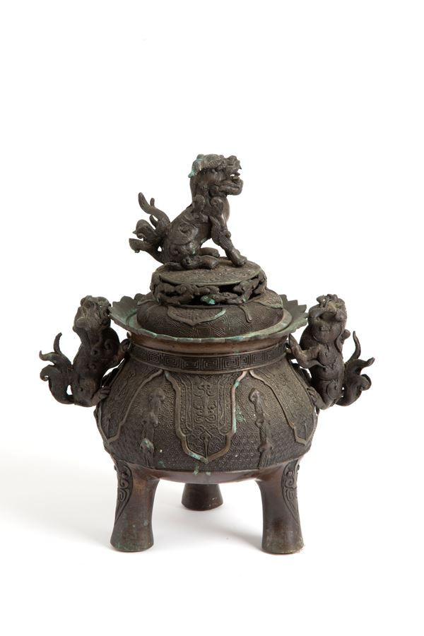 Incensiere in bronzo finemente cesellato. Manici e coperchio con cani di Fo. Periodo Meji. Giappone. Lievi difetti.