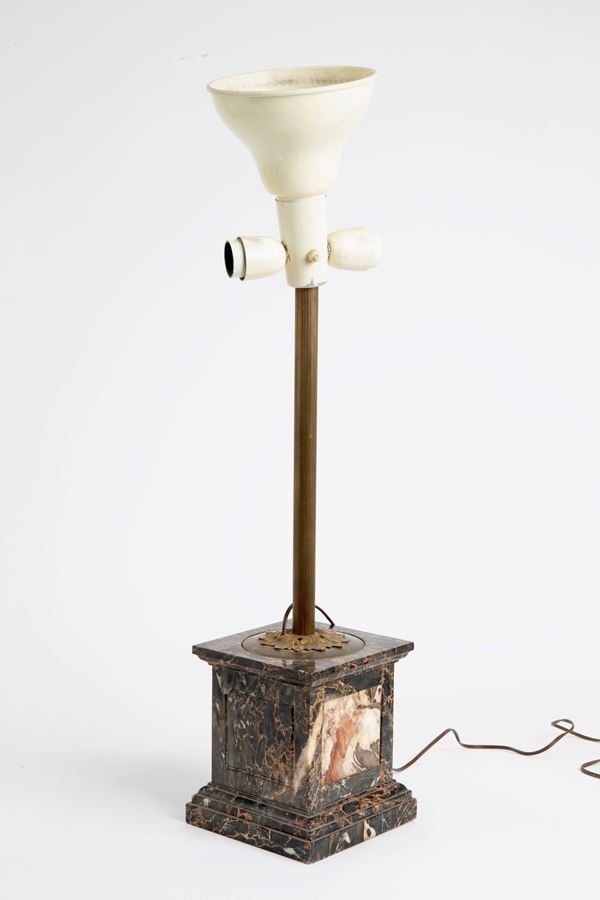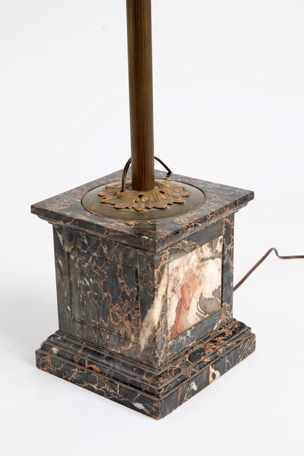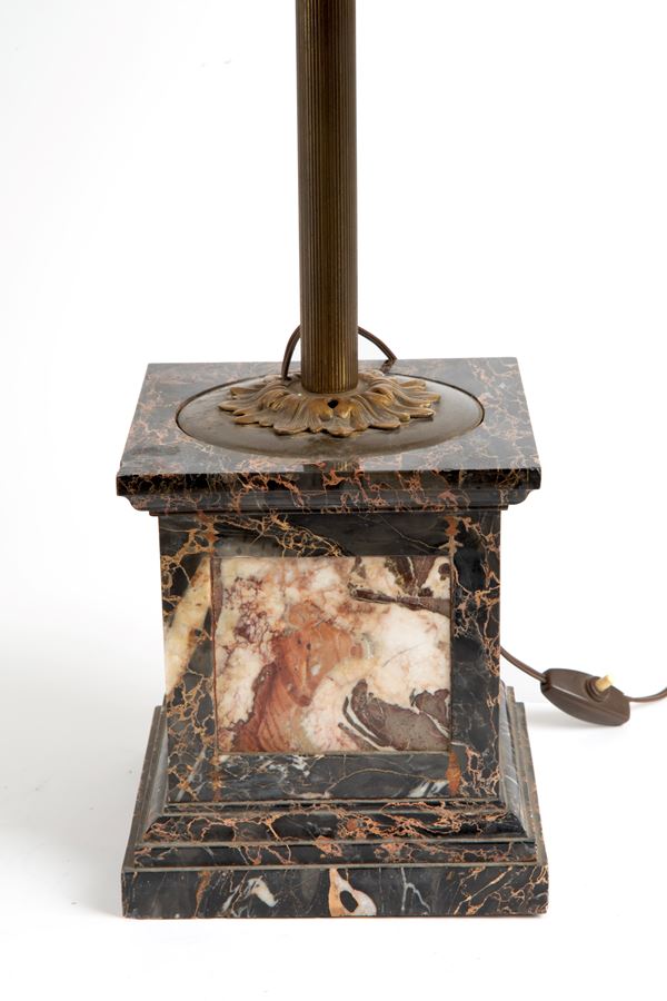 Lampada da tavolo tre luci con base in marmi vari, stelo in bronzo dorato e paralume quadrato in tessuto. Fine XIX-inizi XX secolo.