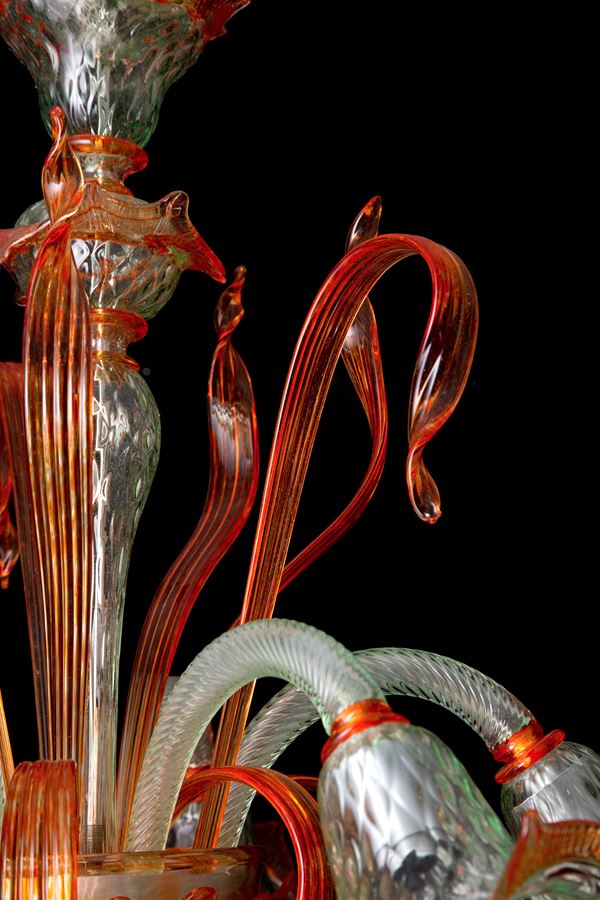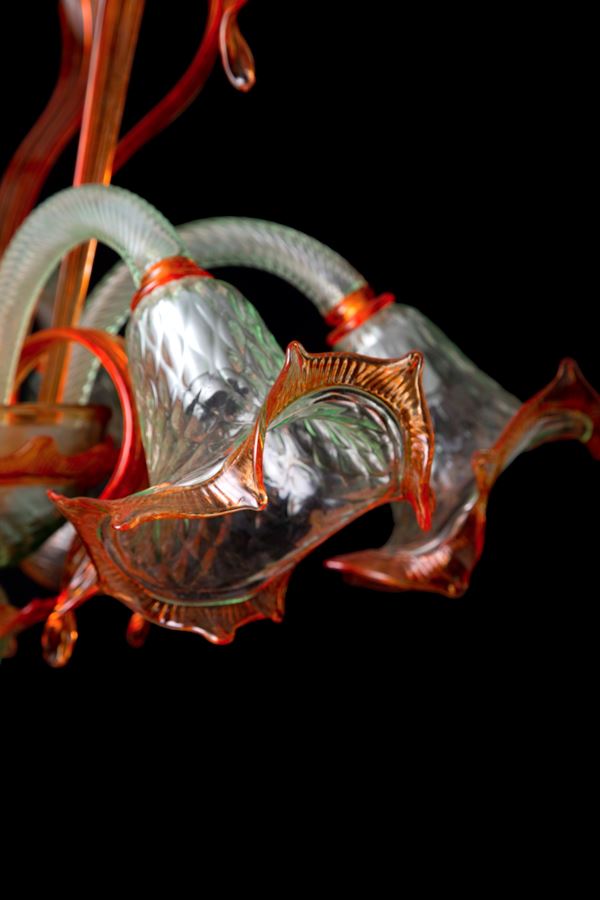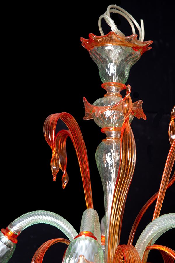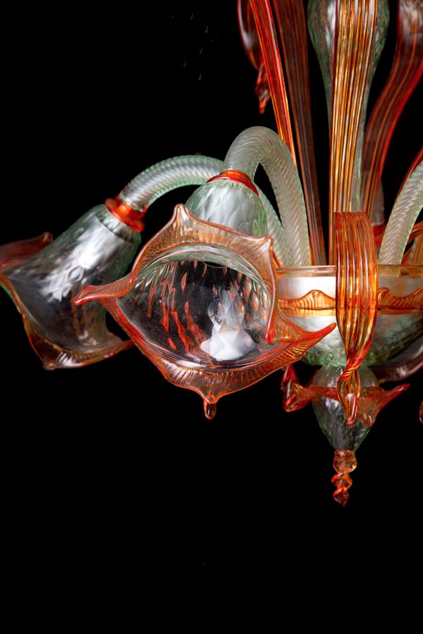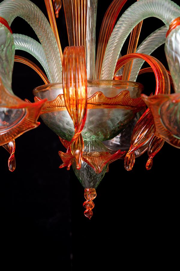 Lampadario cinque luci in vetro di Murano arancione e verde acqua. XX secolo.