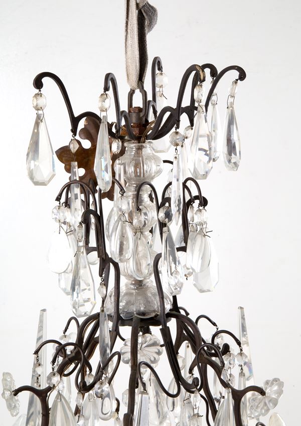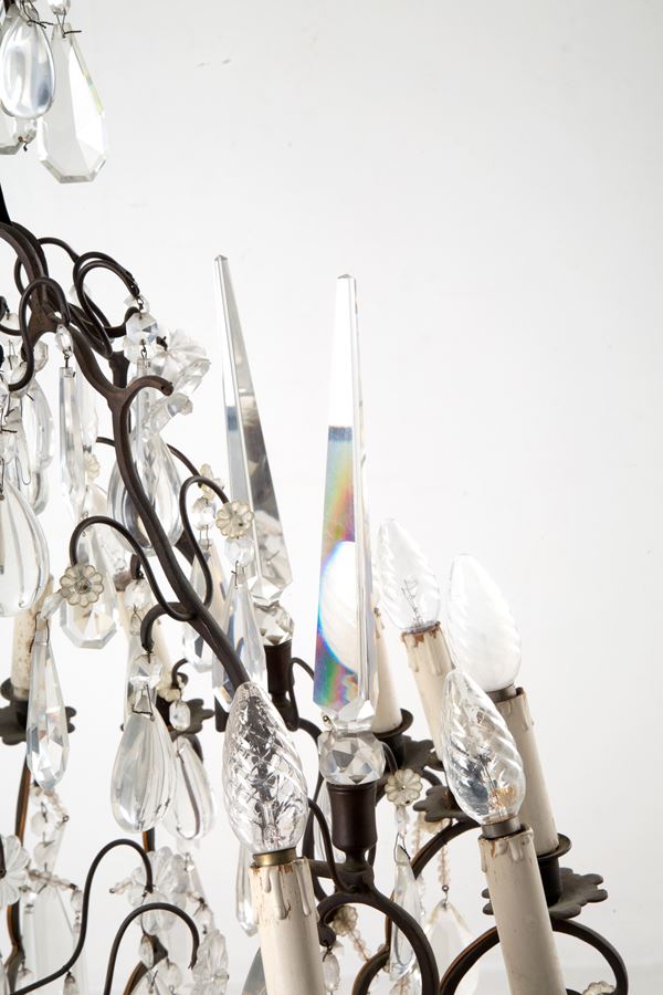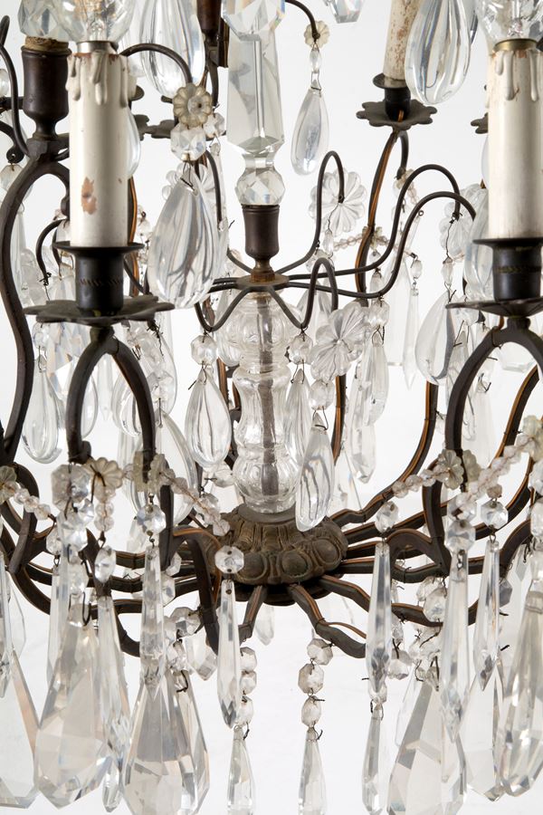 Lampadario quattordici luci in ottone brunito con gocce e pinnacoli in vetro. XIX secolo. Difetti e mancanze.