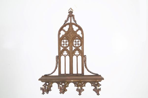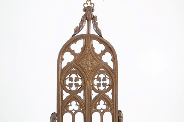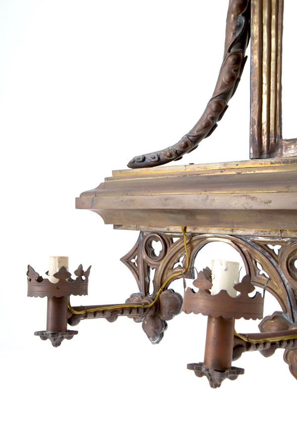 Lampadario Neogotico otto luci in bronzo e rame sbalzato. Difetti.