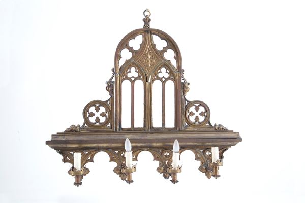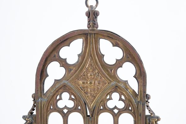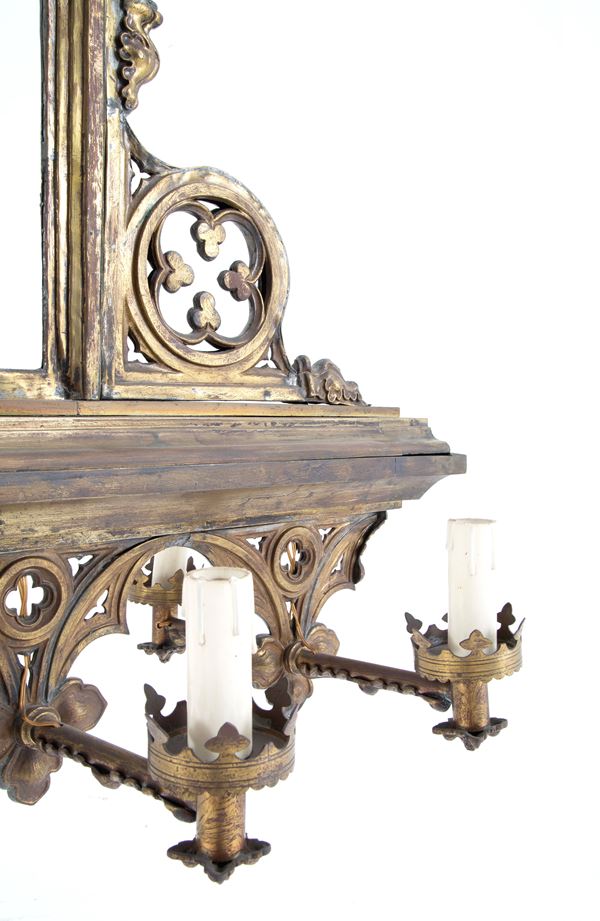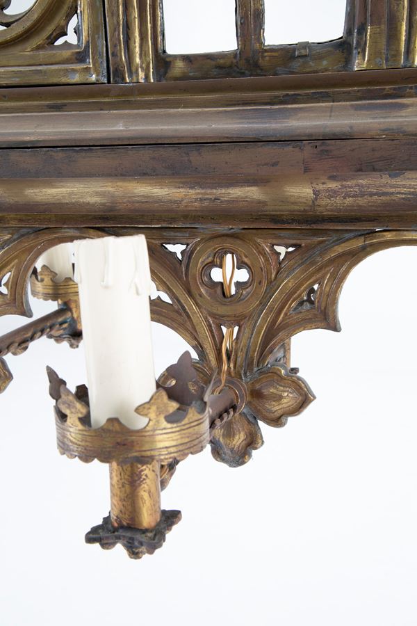Lampadario Neogotico otto luci in bronzo e rame sbalzato. Difetti.