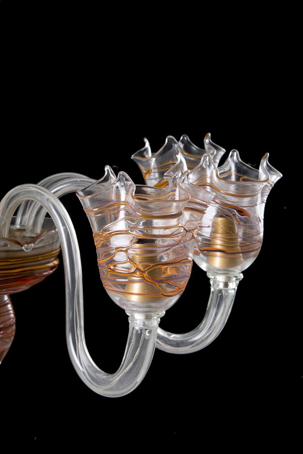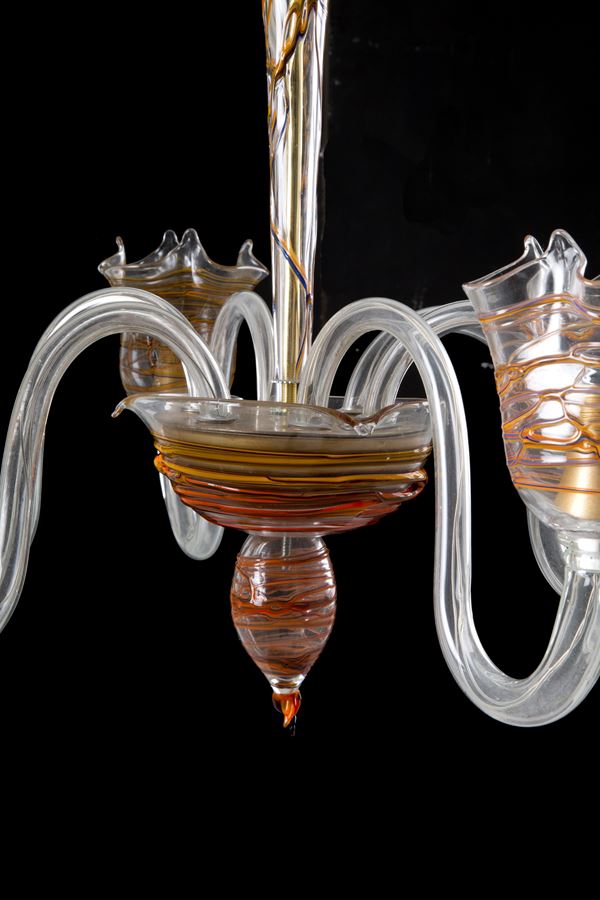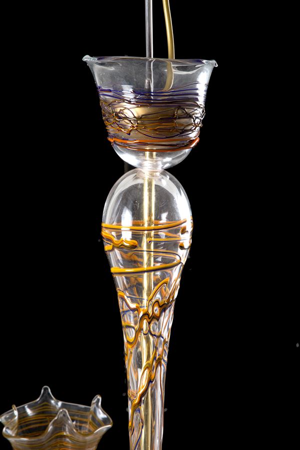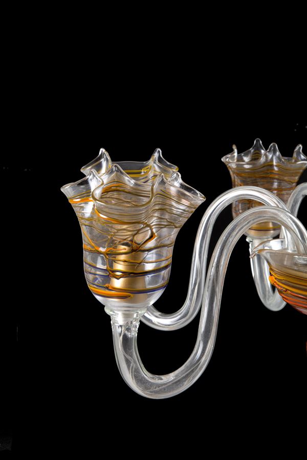Lampadario sei luci in vetro trasparente con decori gialli e blu. XX secolo.