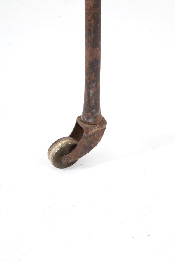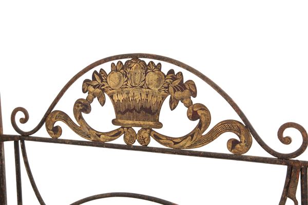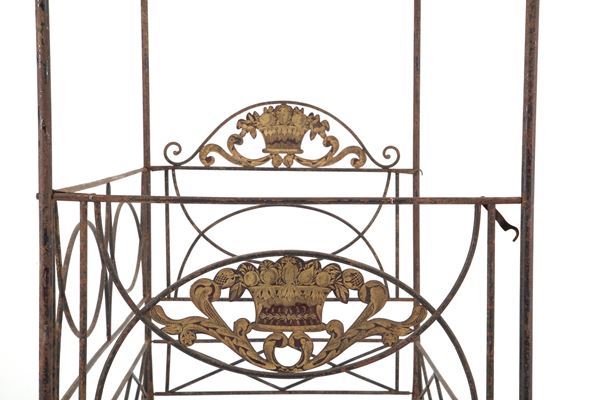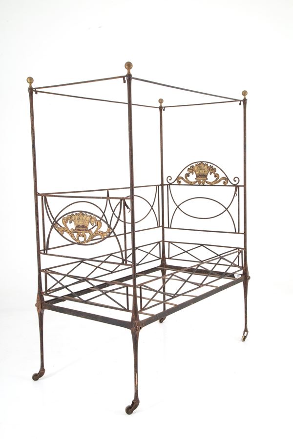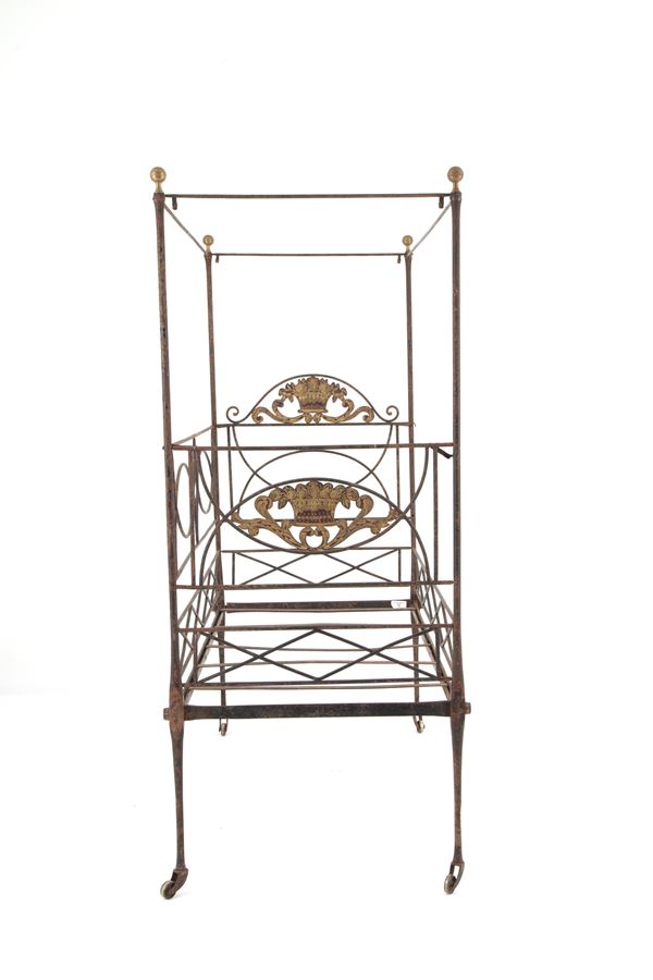 Lettino a baldacchino su rotelle in ferro battuto dipinto in oro zecchino con quattro terminali a pomello in bronzo dorato e sponda reclinabile. Toscana. Inizi XIX secolo. Difetti e mancanze.