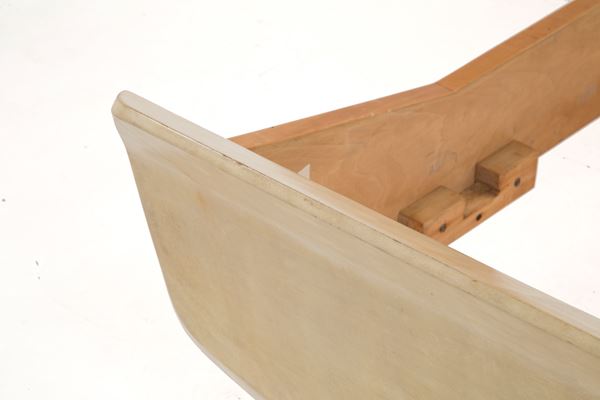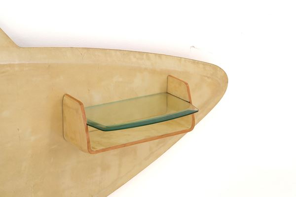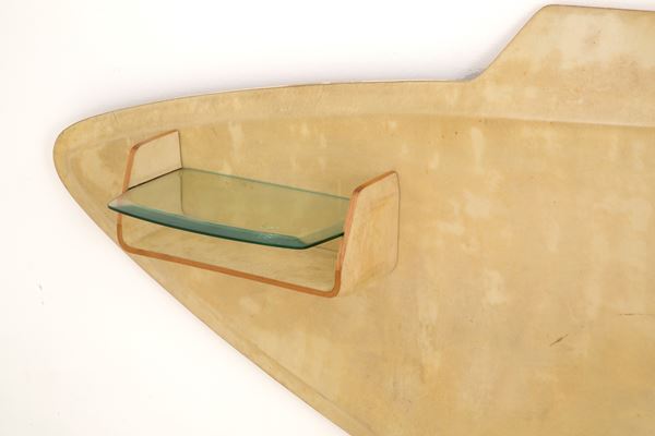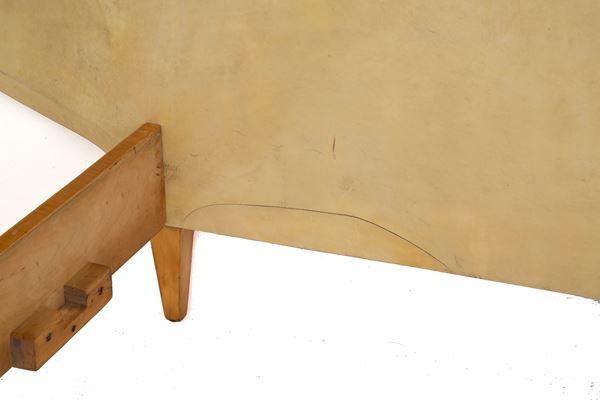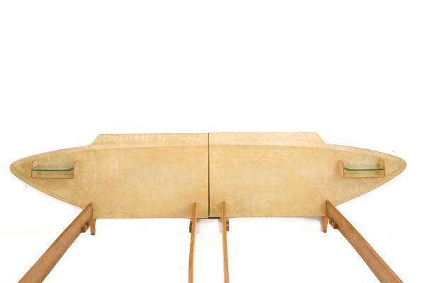 Letto in legno rivestito in pergamena con comodini con piano in vetro e piedini in ottone. Anni '70. Difetti.