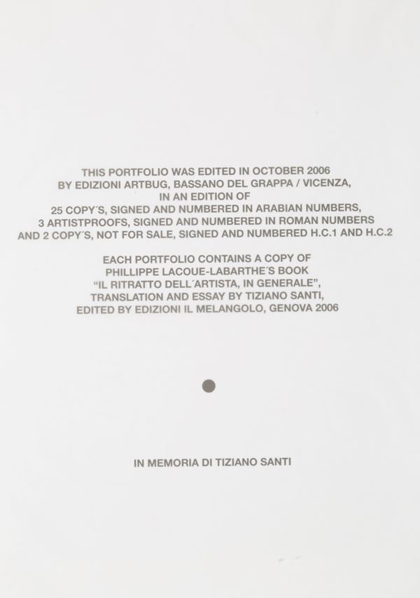 Portfolio, serie di nove stampe ultrachrome "JUST ANOTHER STORY ABOUT LEAVING, 1974". Firma, esemplare numero 12/25 e numeri romani da I a IX serigrafati in basso al centro su ciascuna foto. Esposto alla mostra "La fotografia della collezione Trevisan. Con gli occhi, con il cuore, con la testa", Mart, Rovereto, luglio-novembre 2012. Pubblicato nel catalogo della mostra, p. 72.