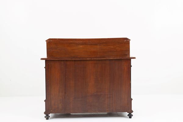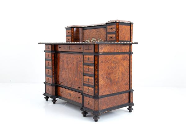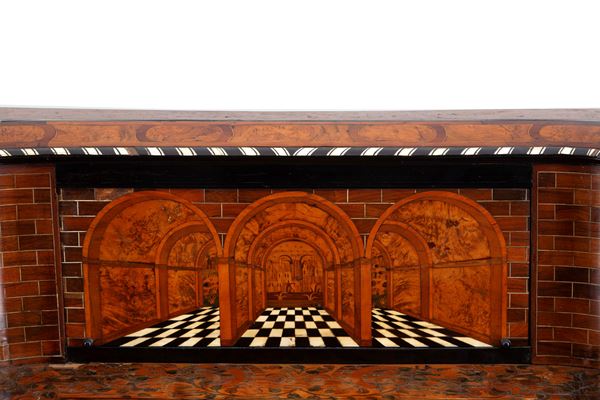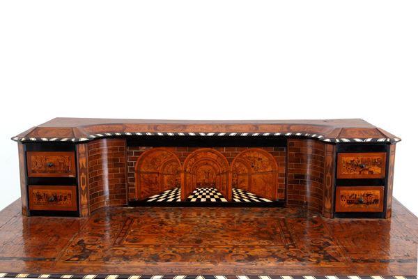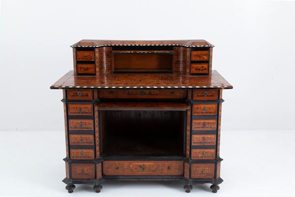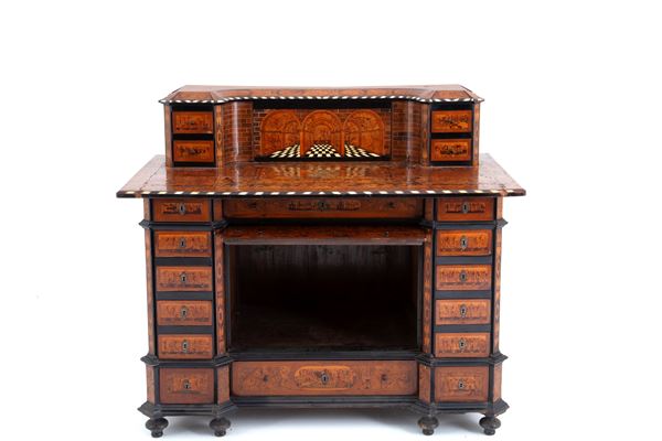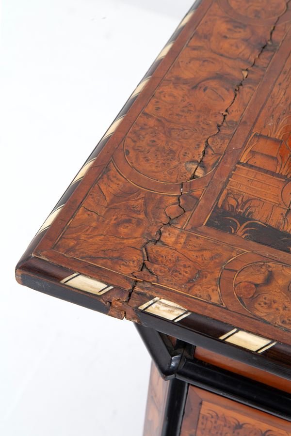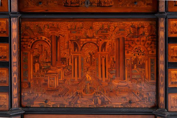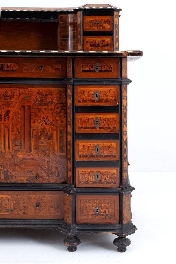 Mobile con alzata finemente lastronato e intarsiato con architetture, fiori, frutta, paesaggi e profili in ebano e osso. Toscana. Fine XVII-inizi XVIII secolo. Lievi difetti e restauri.