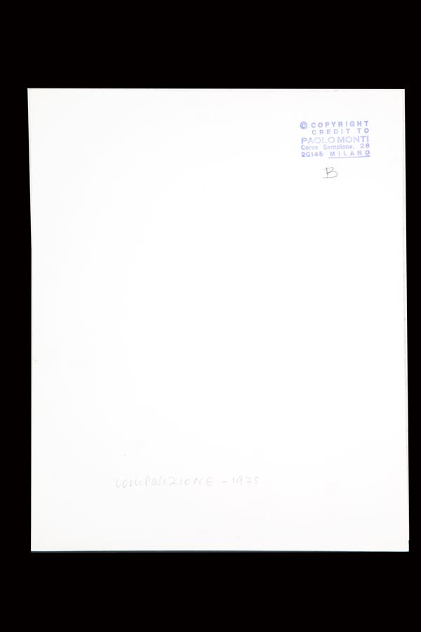 Stampa alla gelatina ai sali d'argento "COMPOSIZIONE, 1975". Timbro del fotografo, titolo e data a matita sul retro.