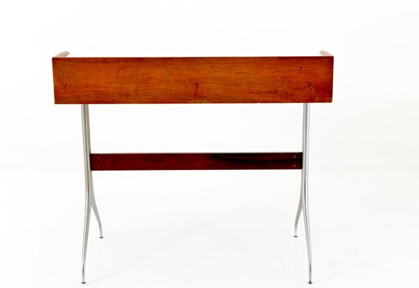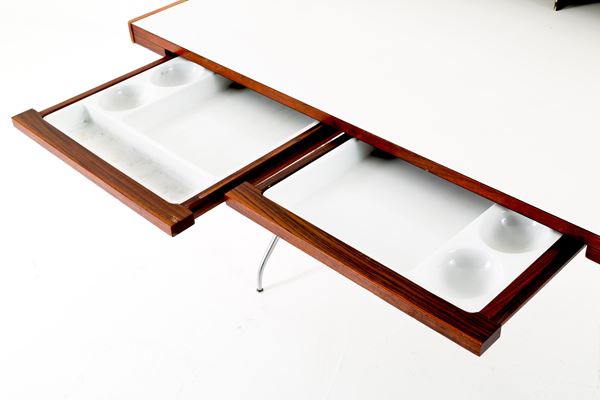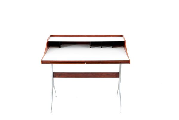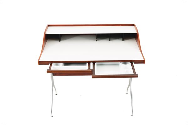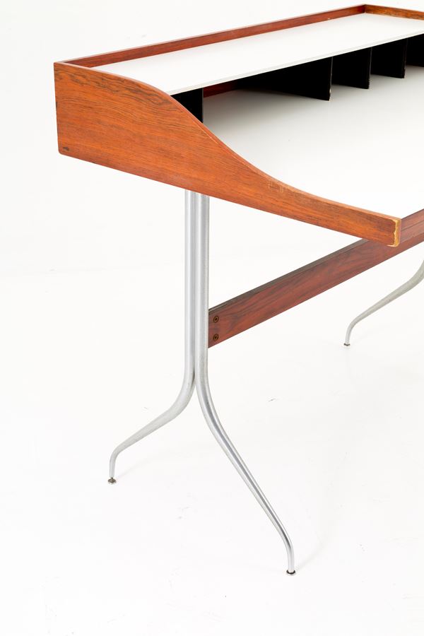 Scrittoio Home Desk in legno e metallo cromato con piano in legno laccato lucido e due cassetti sottopiano con contenitori estraibili in materiale plastico. Anni '70. Lievi difetti e segni di usura del tempo.