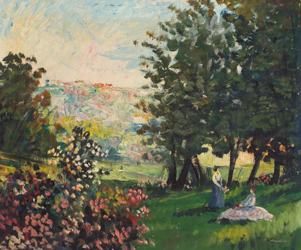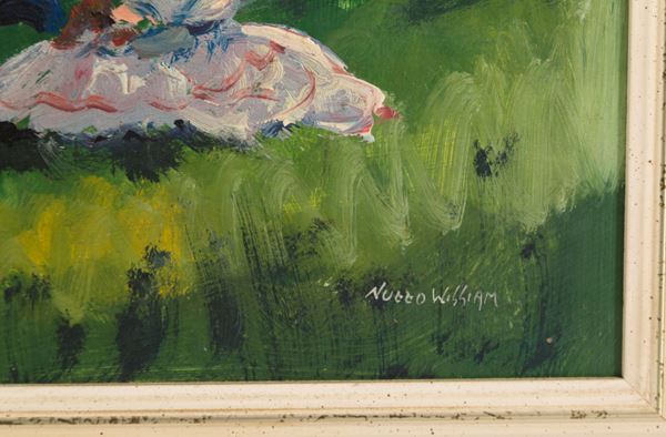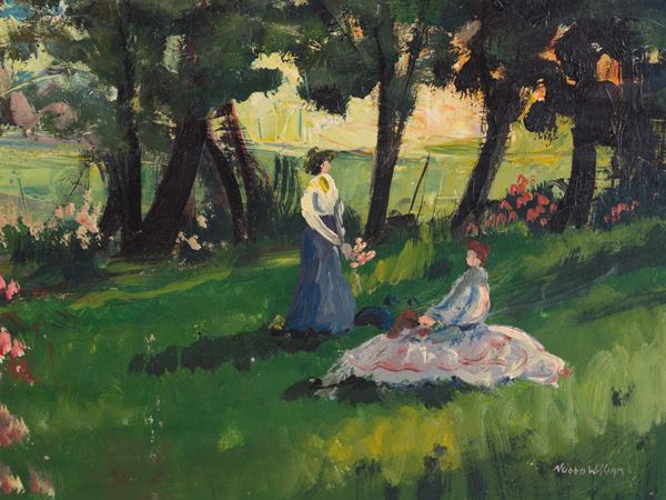 Dipinto olio su masonite raffigurante "PAESAGGIO CAMPESTRE CON DAME". Firmato in basso a destra. Periodo accademico. In cornice dorata. Con autentica dell'artista sul retro.