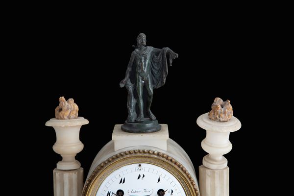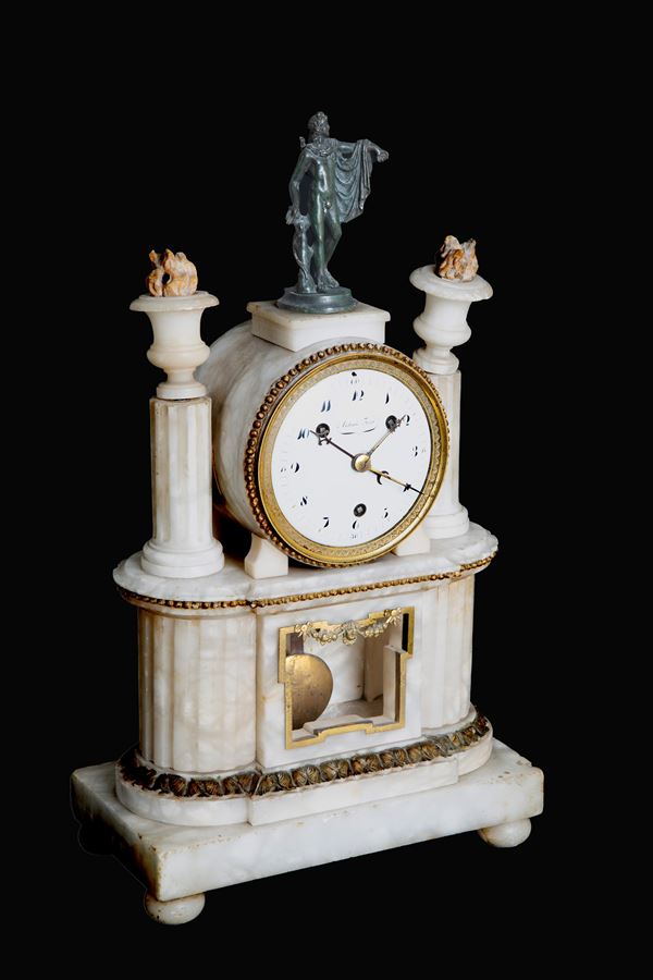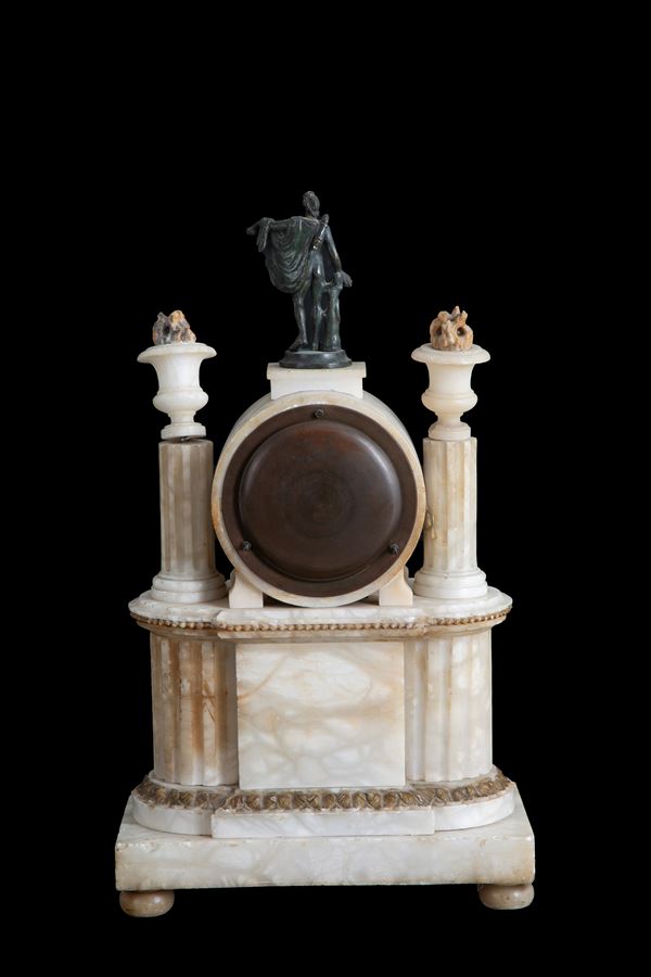 Orologio in alabastro con finiture in bronzo cesellato. Inizi XIX secolo. Lievi difetti.