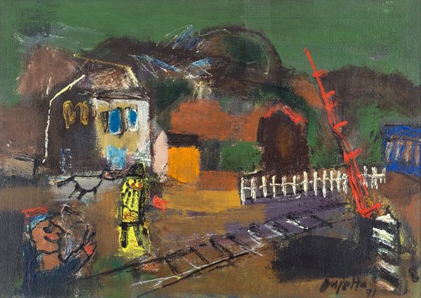 Acrilico su tela raffigurante "PASSAGGIO A LIVELLO". Firmato e datato '71 in basso a destra. In cornice. Numero di archiviazione 3898. Esposto alla mostra "Guido Pajetta (1898-1987). Acrilici", Fondazione Stelline, Milano, maggio 1998. Pubblicato nel catalogo generale ragionato dei dipinti di Guido Pajetta; a cura di Enrico Crispolti. Vol. II, p. 1020.