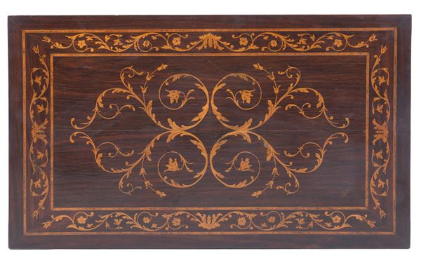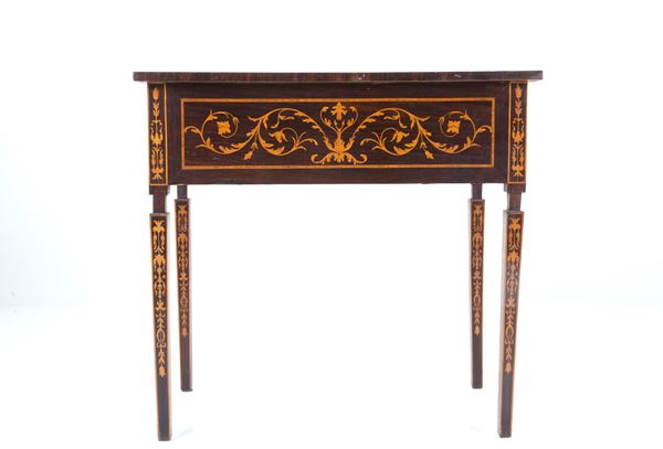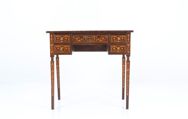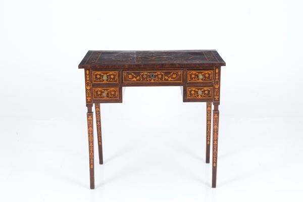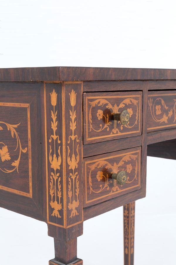 Piccolo scrittoio lastronato e intarsiato a motivi a giragli con cinque cassetti sulla fascia e gambe rastremate. In stile Luigi XVI. Lievi difetti.