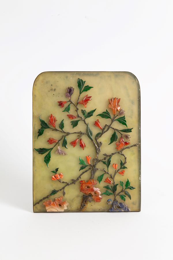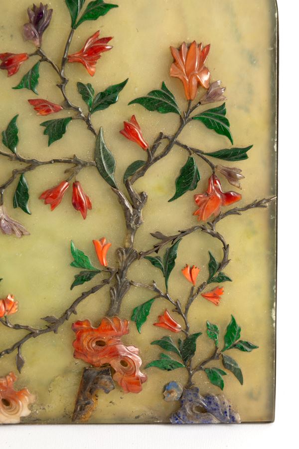 Placca in giada verde, smeraldo e pietre dure raffigurante "RAMO FIORITO" con montatura in argento 800. Cina. Difetti e mancanze.