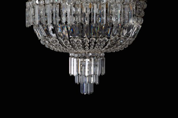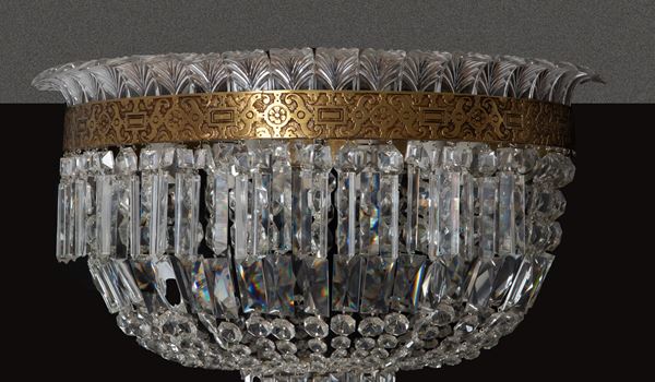 Plafoniera sei luci con pendenti in cristallo. XX secolo. Lievi difetti.