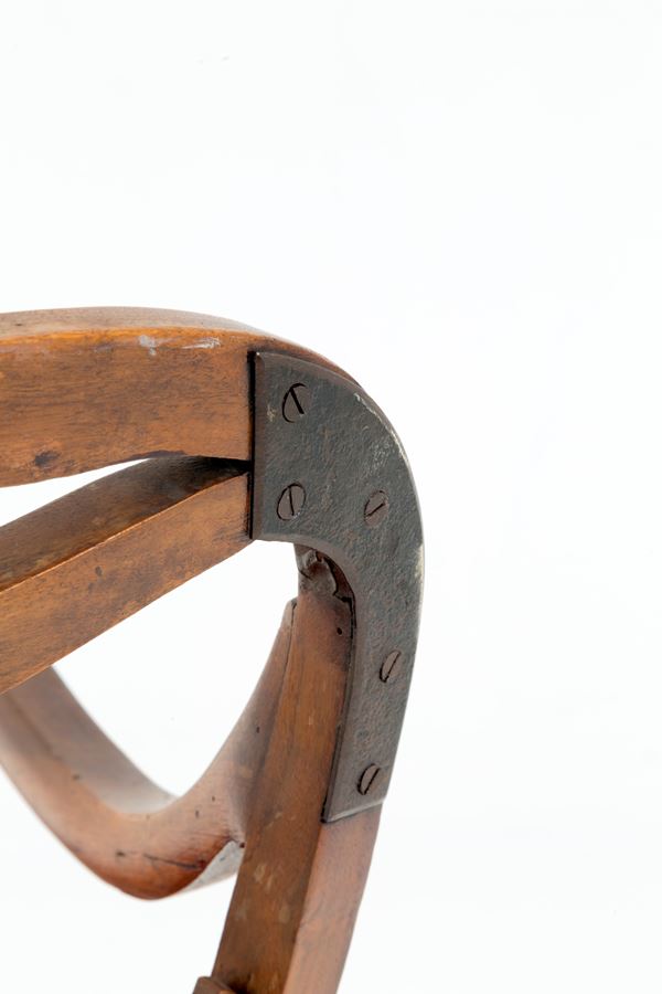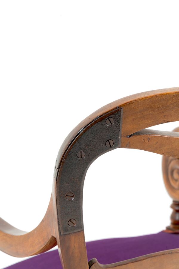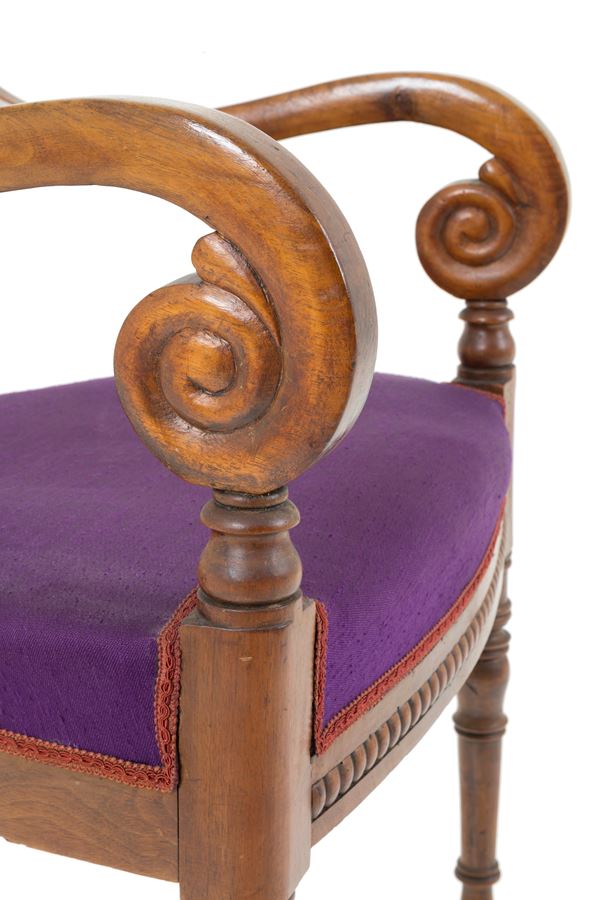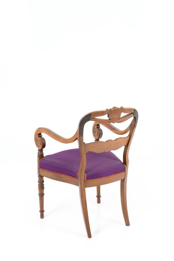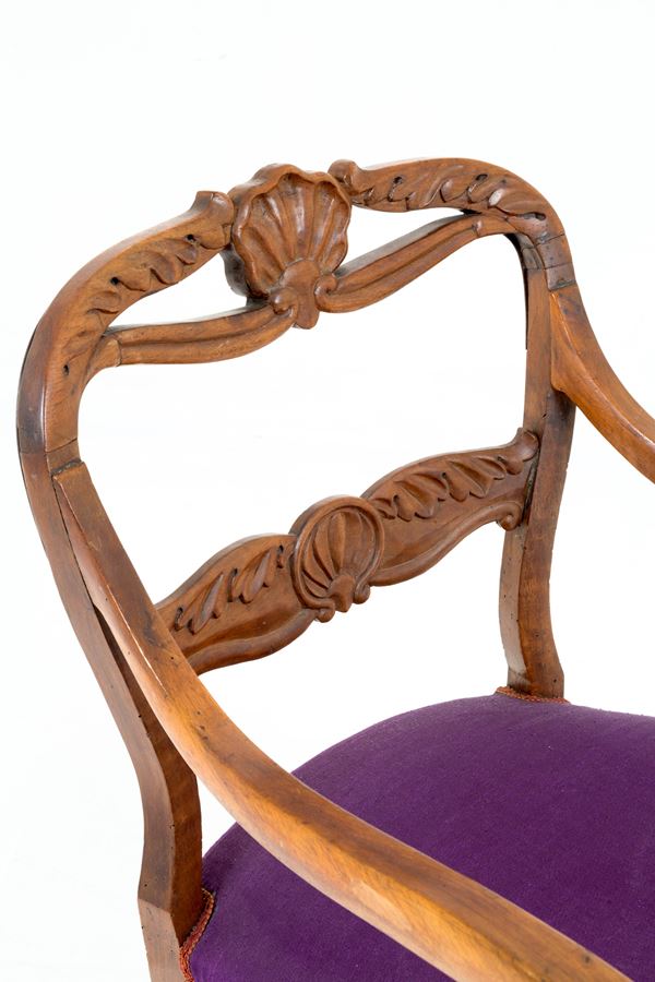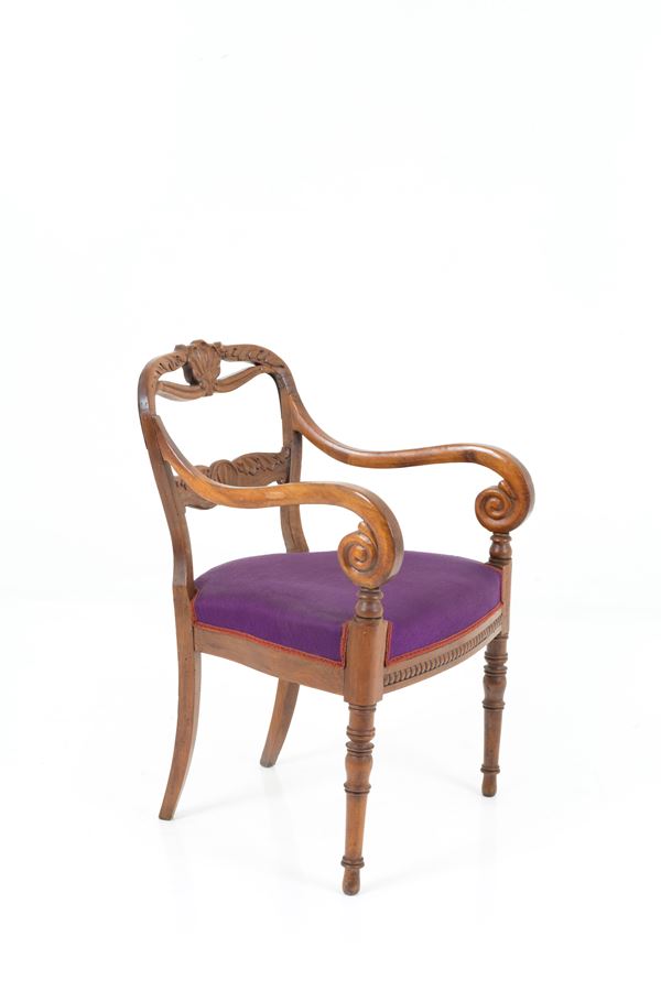 Poltrona in legno intagliato con braccioli mossi, gambe tornite e a sciabola. XIX secolo.