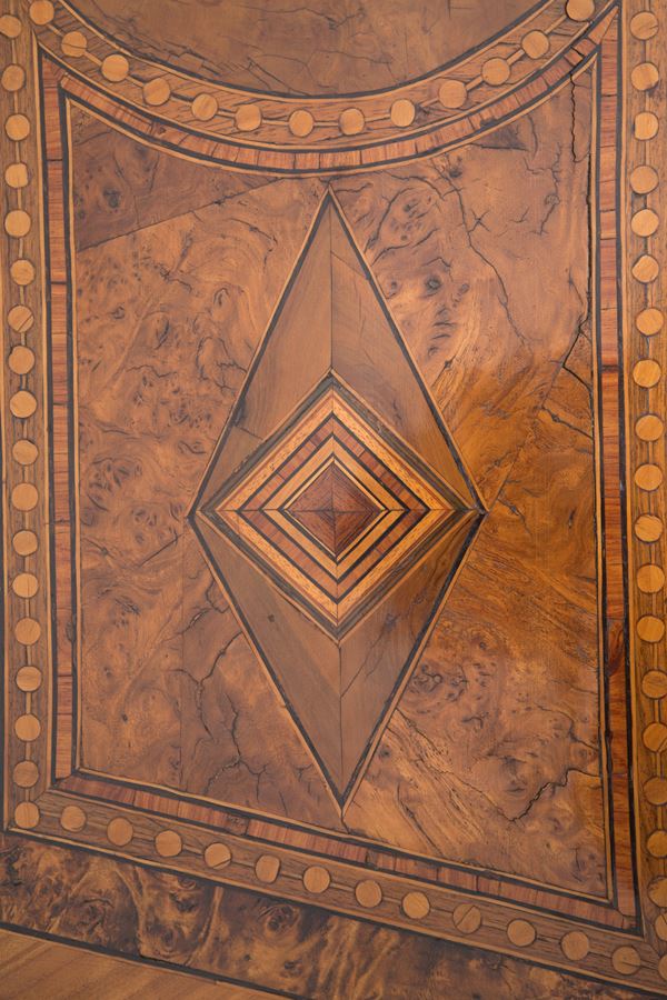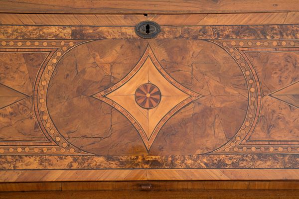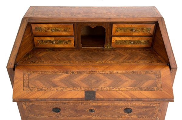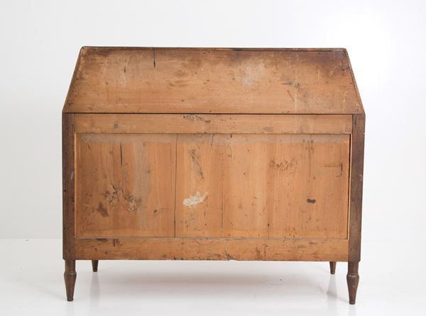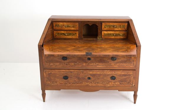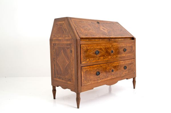 Ribalta lastronata e filettata in legni vari con due cassetti e calatoia. Piacenza. XVIII secolo.