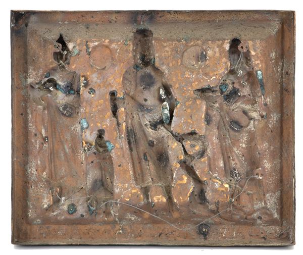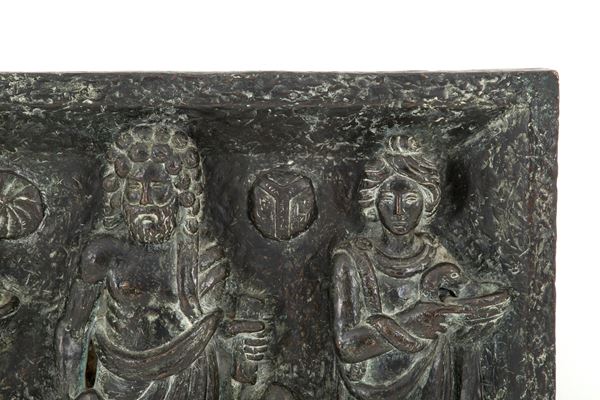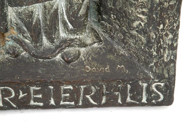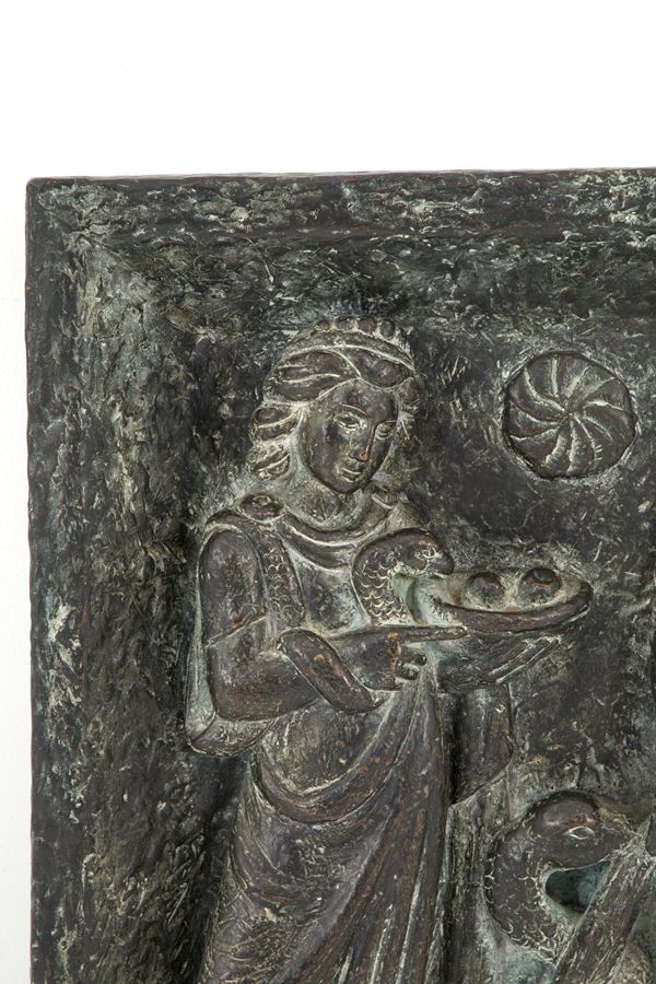 Scultura ad altorilievo in bronzo patinato raffigurante "ASCLEPIO, IGEA E TELESFORO". Firmata DAVID M. in basso a destra. XX secolo.