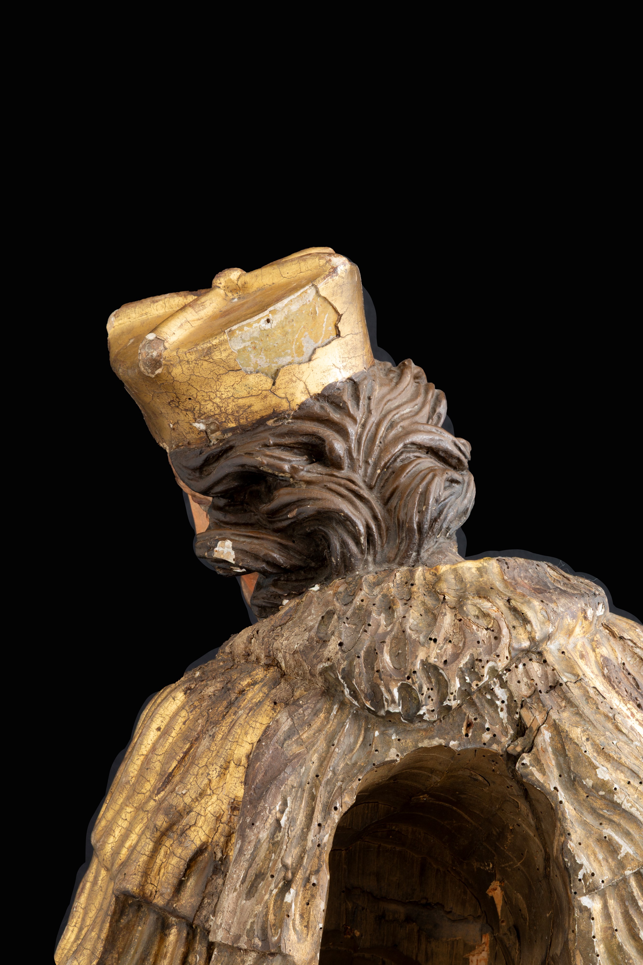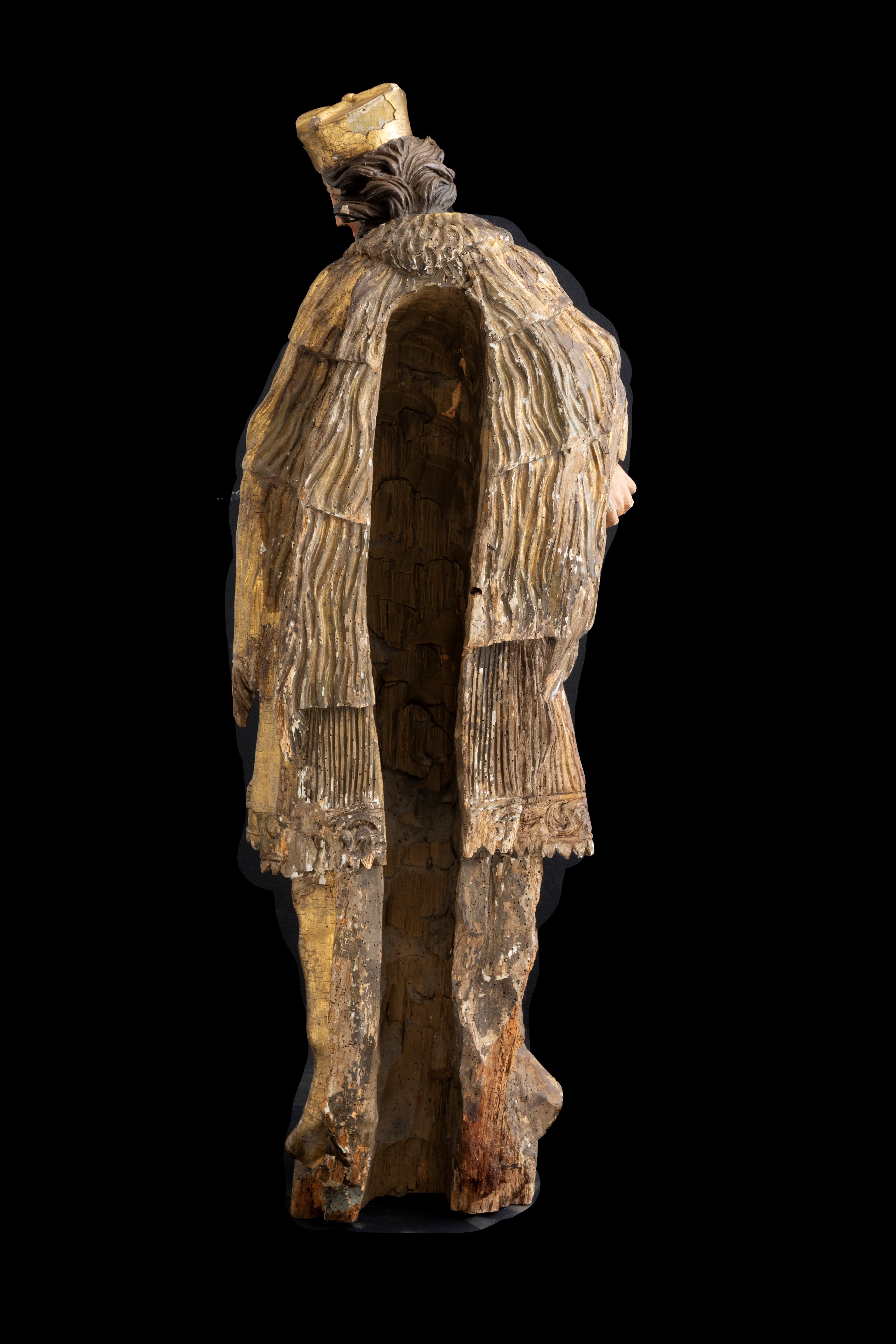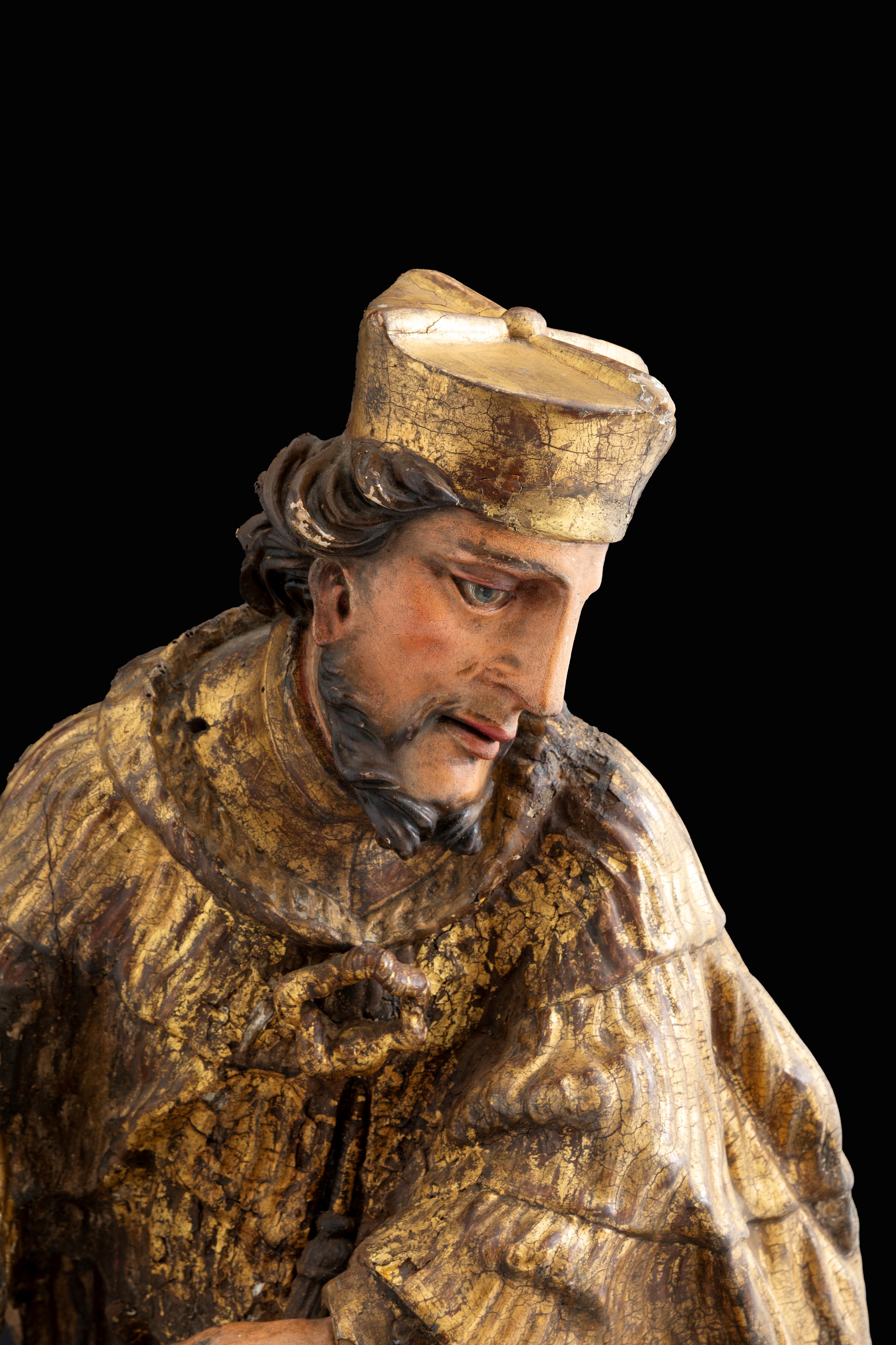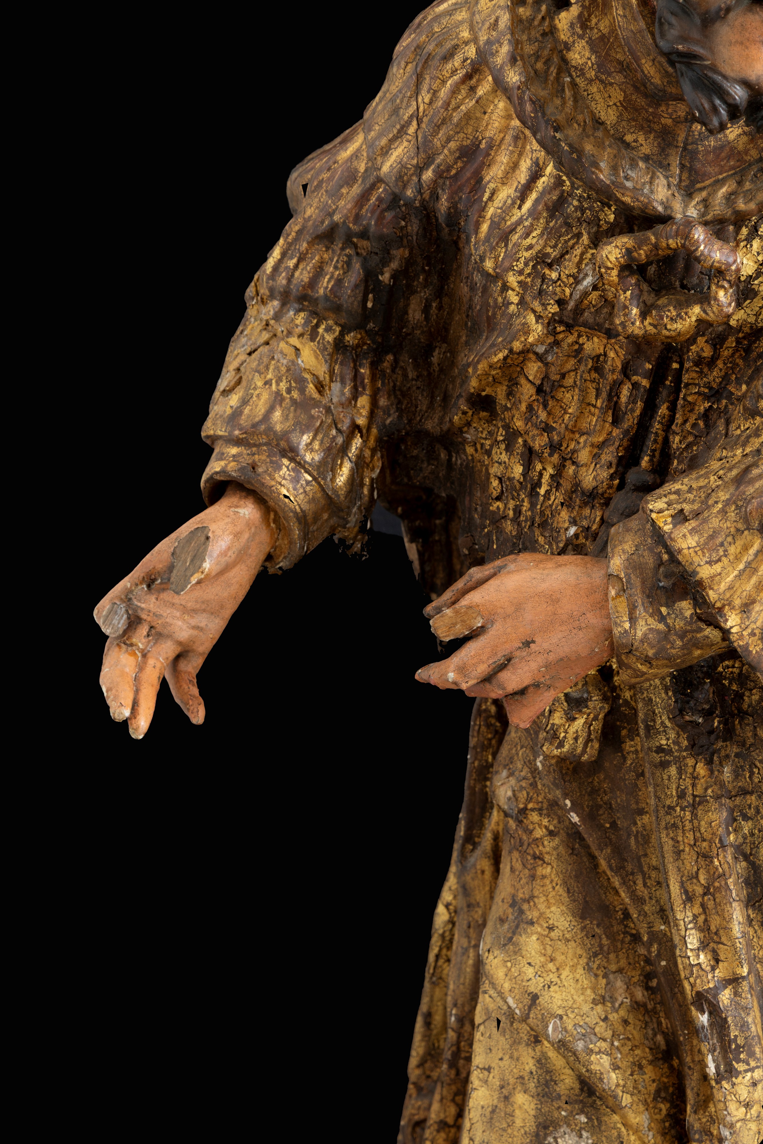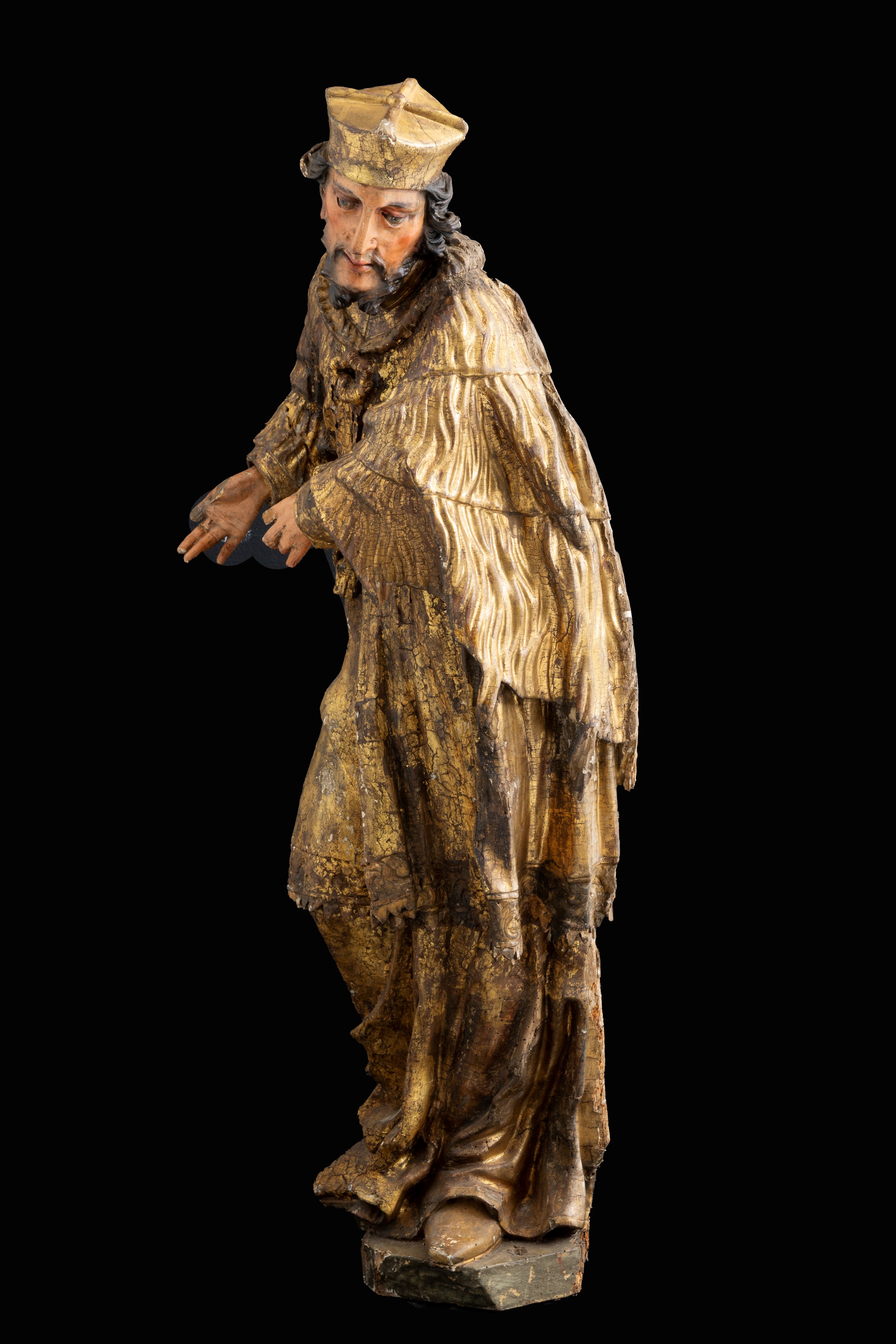 Scultura in legno finemente intagliato, laccato e dorato raffigurante "SAN GIOVANNI NEPOMUCENO". Fine XVI-inizi XVII secolo. Lievi difetti e mancanze.