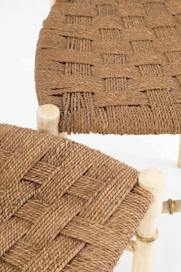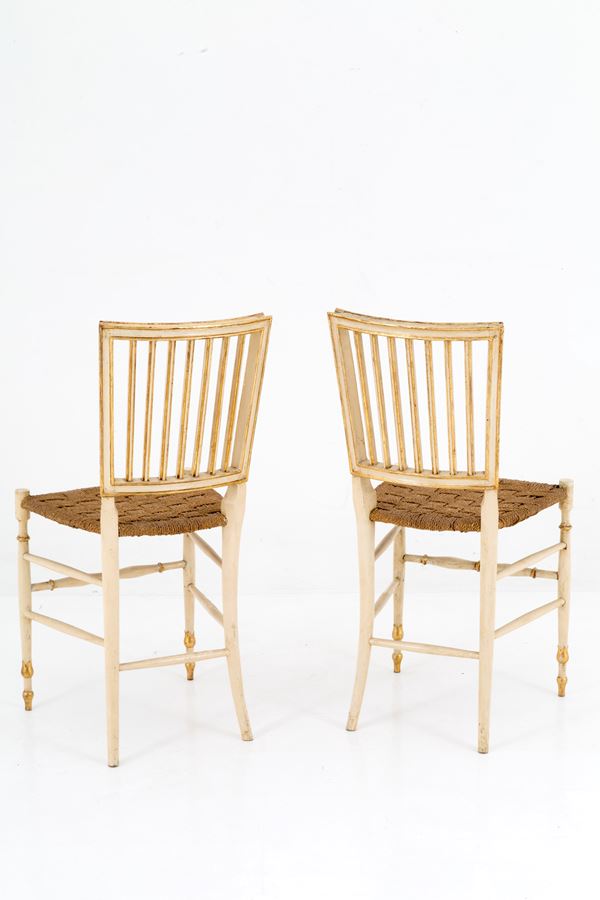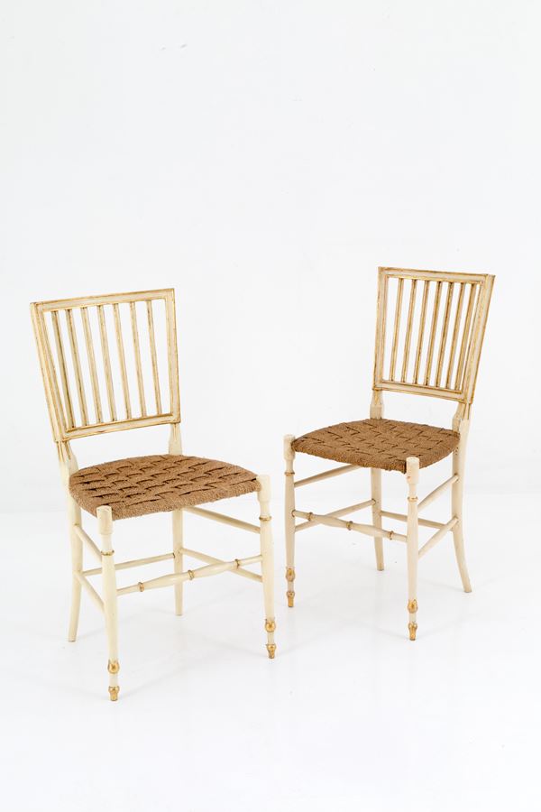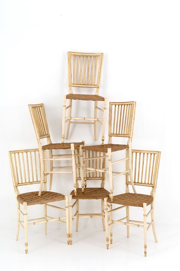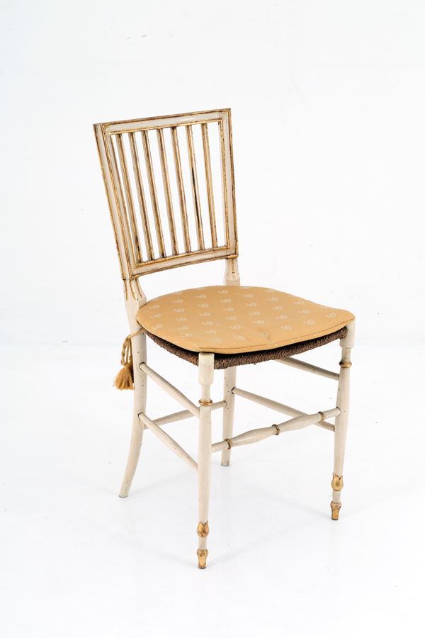 Sei sedie in legno laccato bianco e oro con sedute in paglia e coprisedili in tessuto ocra. XIX secolo. Difetti e rotture.