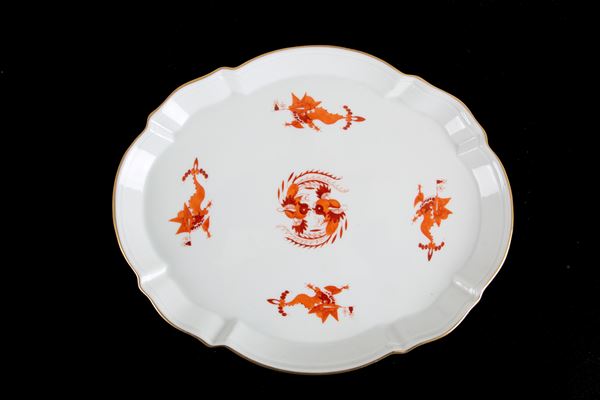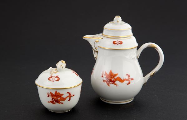 Servizio da caffè tête-à-tête in porcellana di Meissen con motivo drago Ming rosso. Marcato sul fondo di ciascun pezzo. XIX secolo.