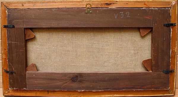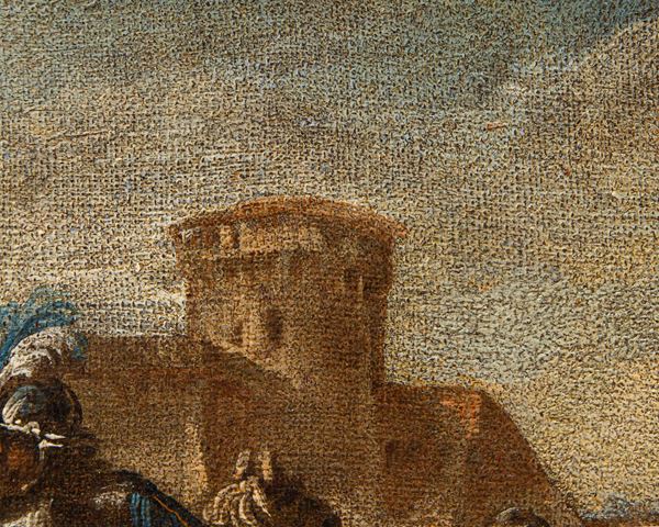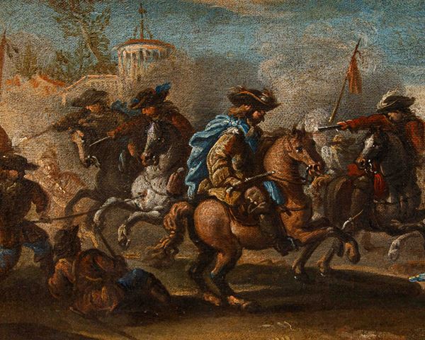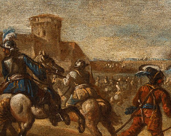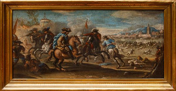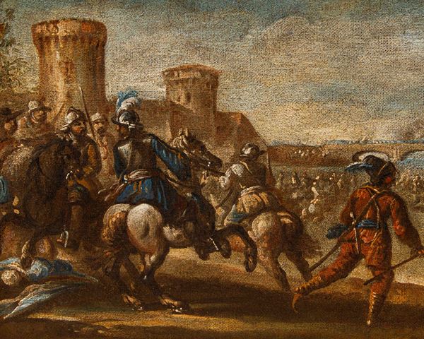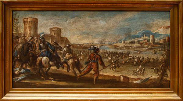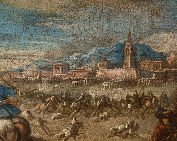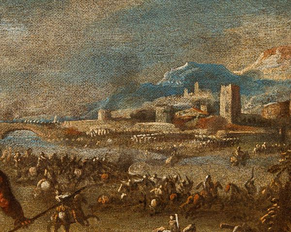 Due dipinti olio su tela raffiguranti "LA BATTAGLIA DI FORNOVO". In cornici. Già rintelati e rintelaiati. Restauri.