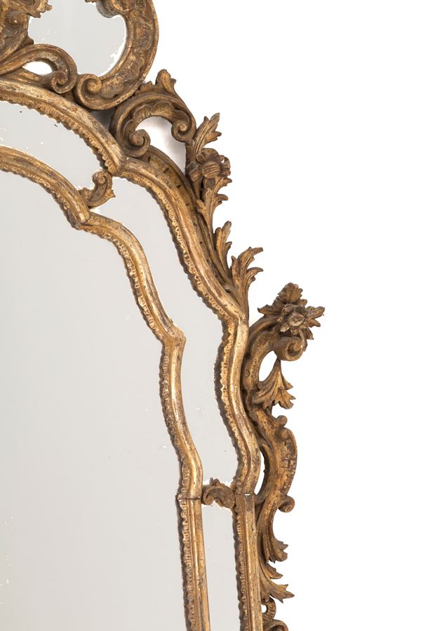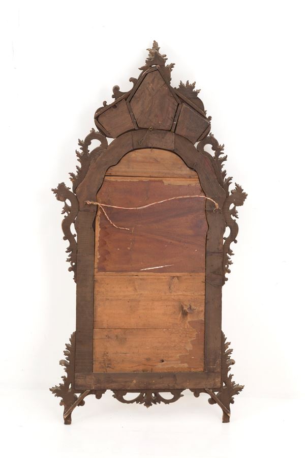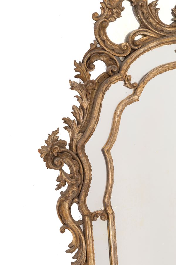 Specchiera in legno intagliato e dorato a mecca. Inizi XX secolo. Lievi difetti e mancanze.