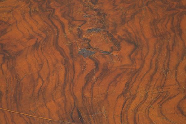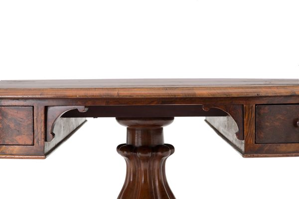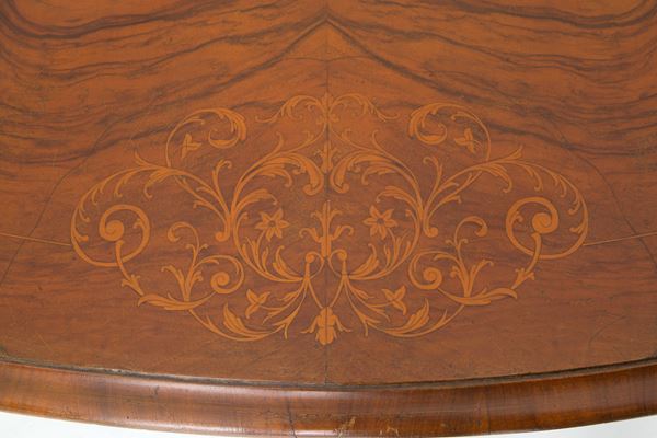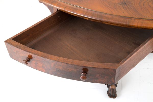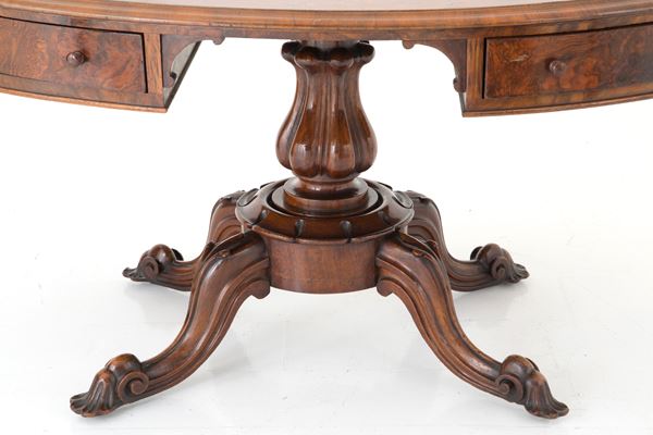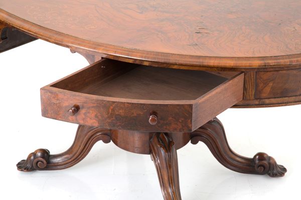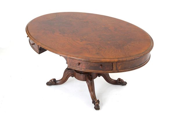 Tavolo-scrittoio ovale in radica di noce con piano intarsiato, cassetti laterali e gamba intagliata in mogano. XIX secolo. Lievi difetti.