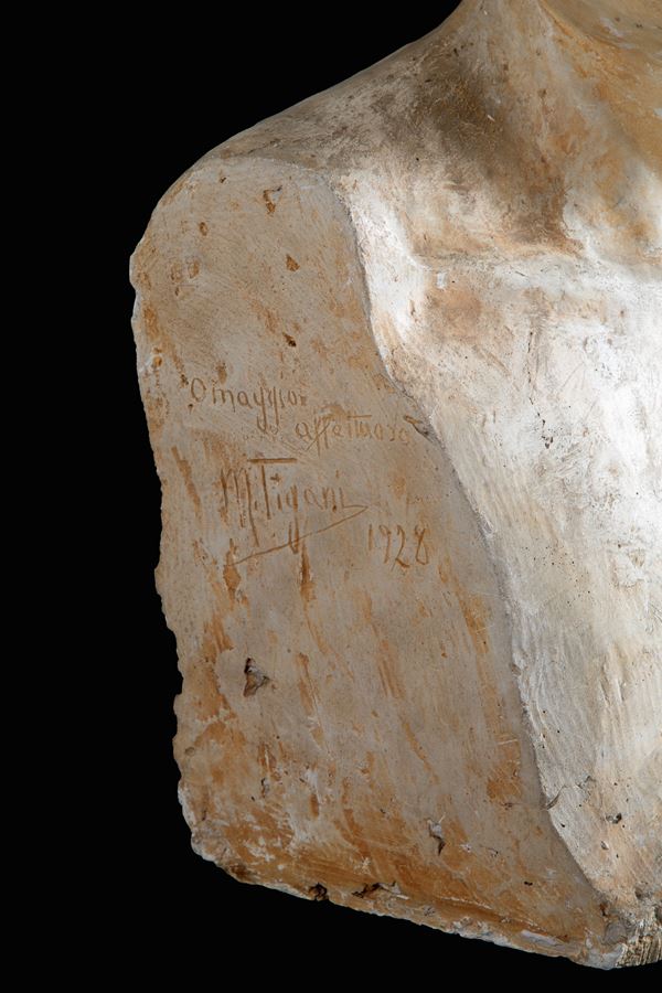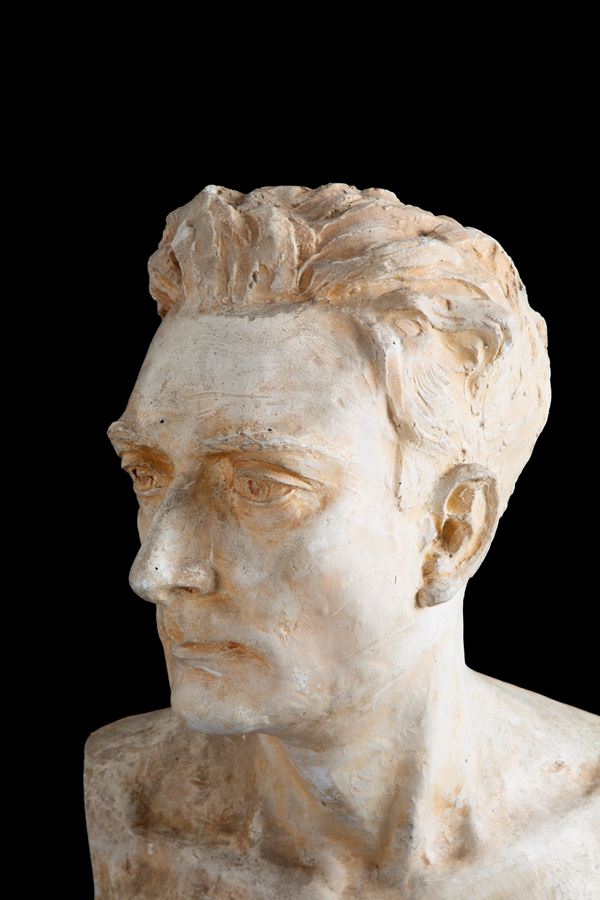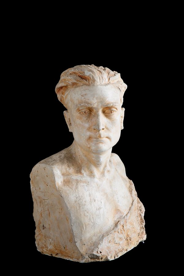 Scultura in gesso raffigurante "BUSTO MASCHILE". Firmata, datata 1928 e con scritta "Omaggio affettuoso" sul lato sinistro. Difetti.