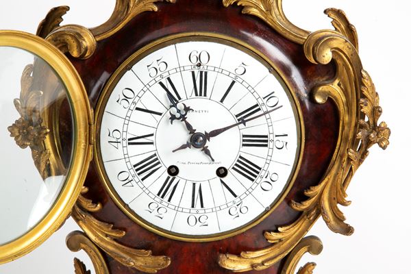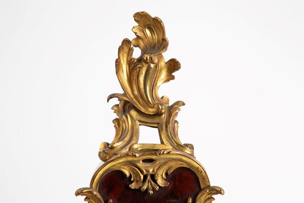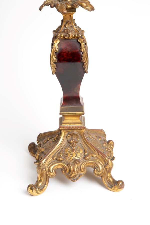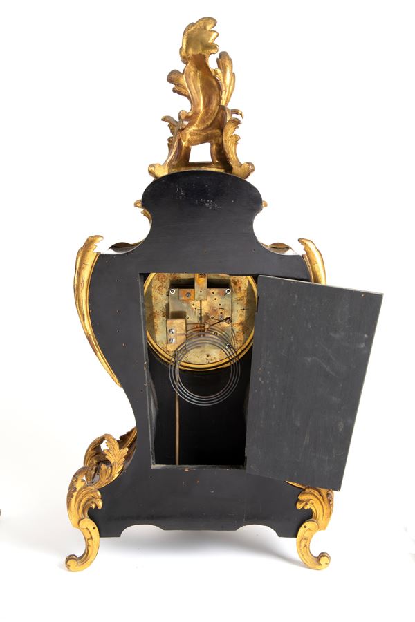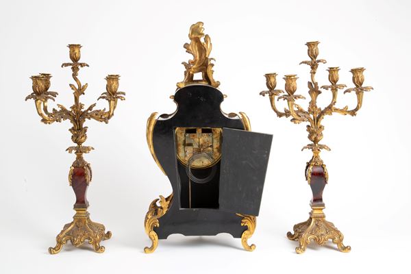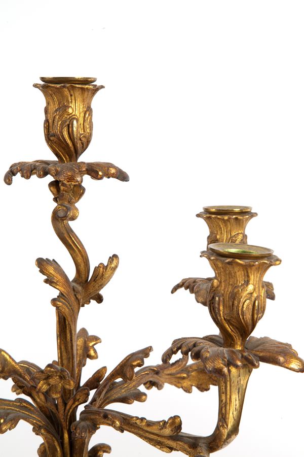 Trittico composto da orologio e due candelabri cinque fiamme in bronzo finemente cesellate e dorate. Produzione JANNETTI. XIX secolo. Mis. Alt. massima cm. 70 ca.