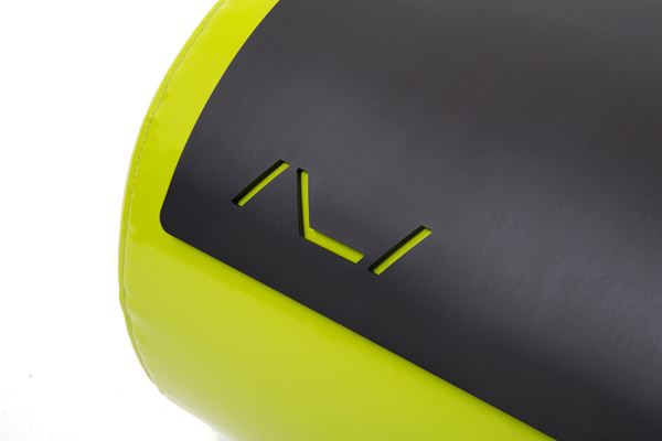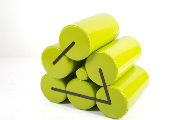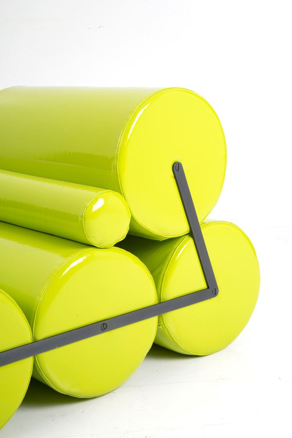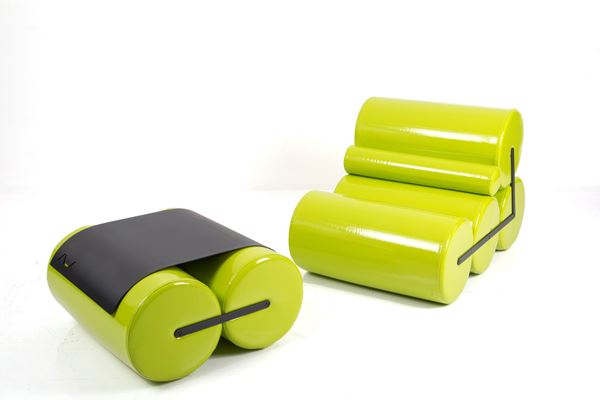 Poltrona 5C con poggiapiedi in vinile verde acido e vassoio coffee table in metallo curvato. Produzione A.L.I., Tencarola. Con marchio traforato sul vassoio. Anni '70. Segni di usura del tempo.