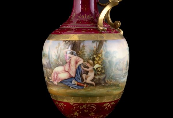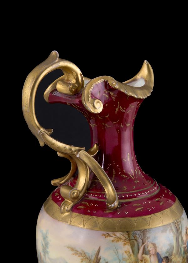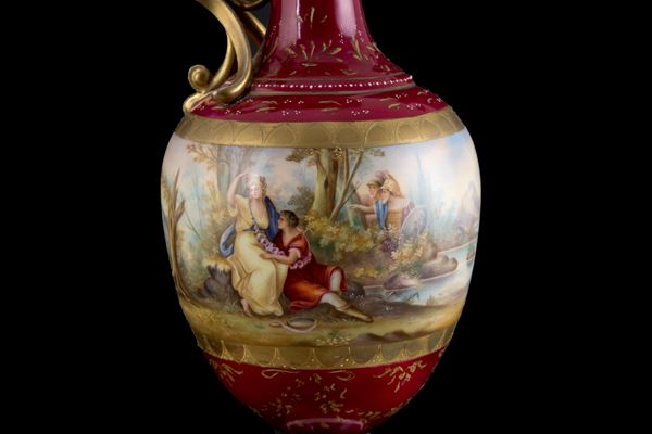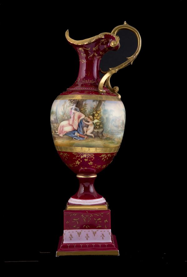 Vaso ad anfora in porcellana dipinta con scene mitologiche. Marcato sul fondo. Vienna. XIX secolo. Lievi restauri sulla base.