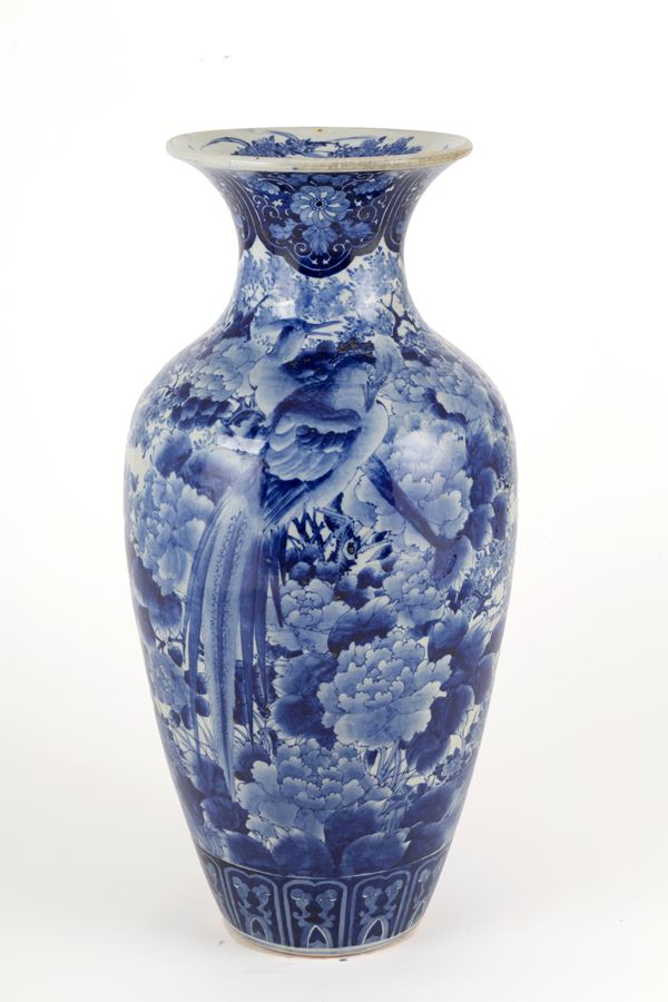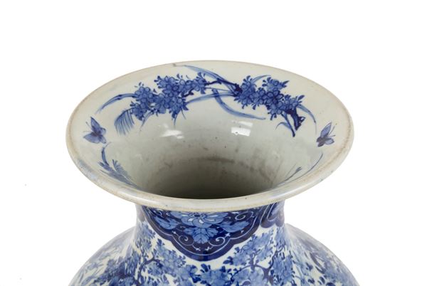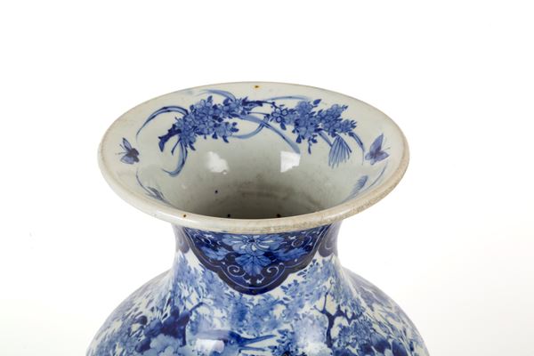 Grande vaso in porcellana bianca e blu decorato a motivi floreali e volatili. Giappone. XIX secolo.